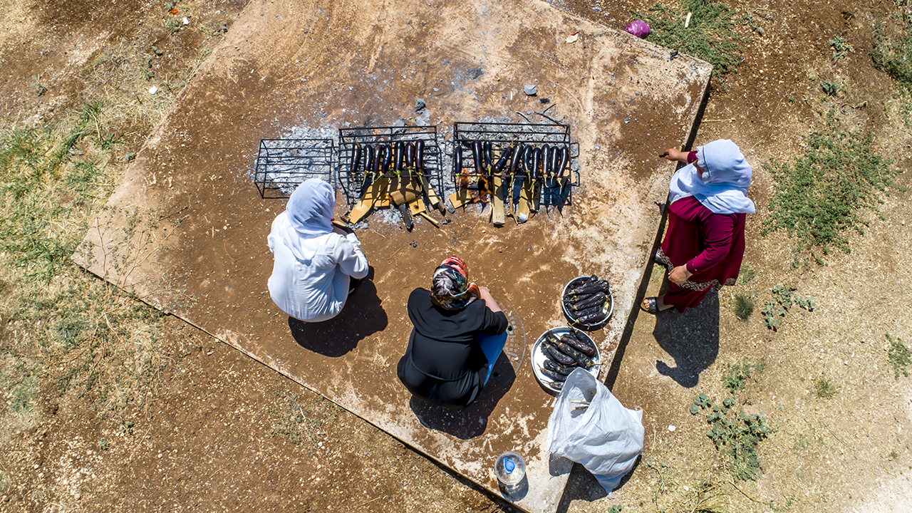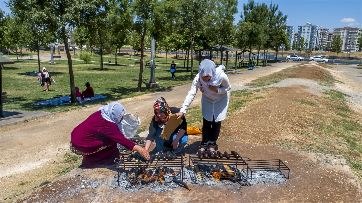 Diyarbakırlı kadınlar hava sıcaklığına rağmen, park, bahçe ve açık alanlarda yakılan mangal ateşinde gün boyu patlıcan közlüyor.