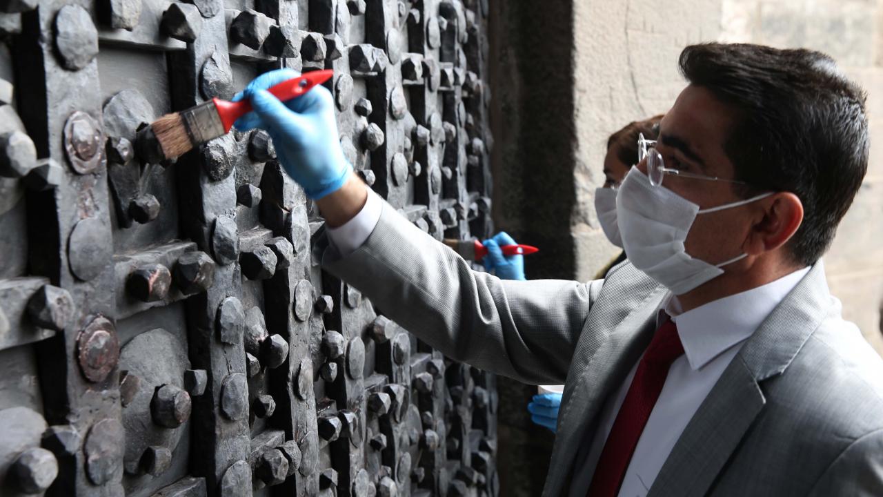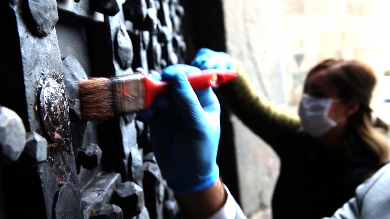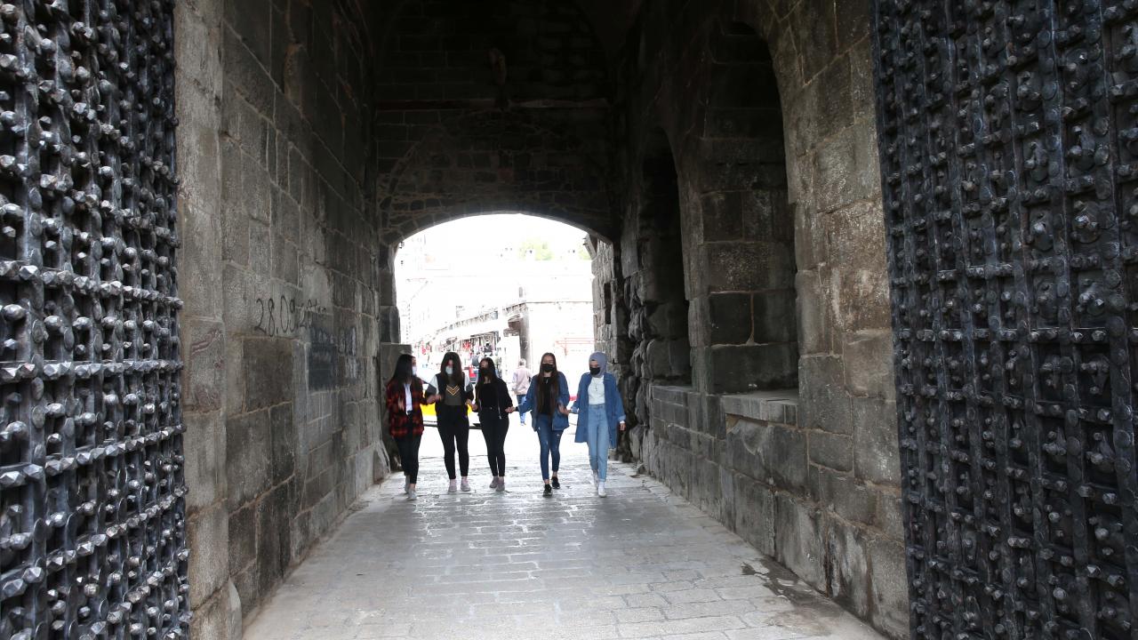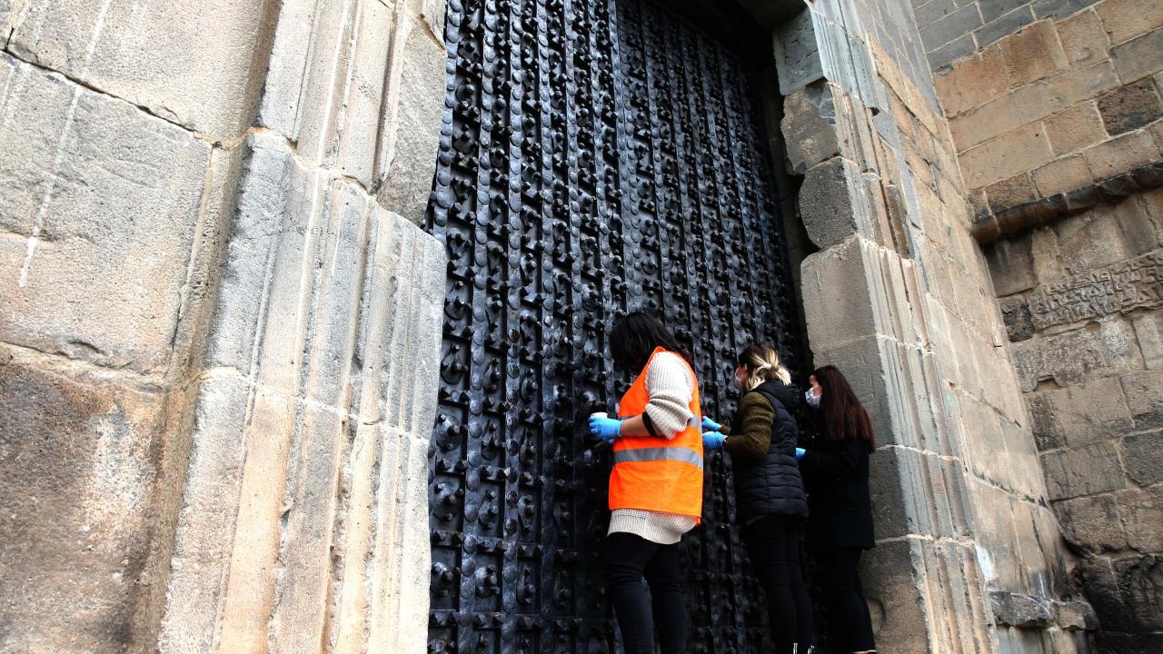 Kente giriş yapılan surun ana kapılarından uzman restoratörler tarafından titizlikle sürdürülen işlemlerin sonucu tamamlandı.