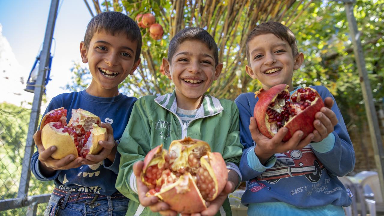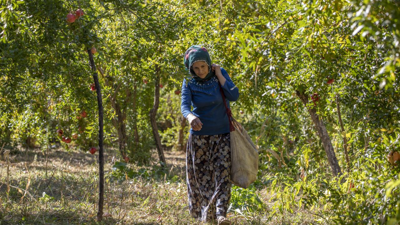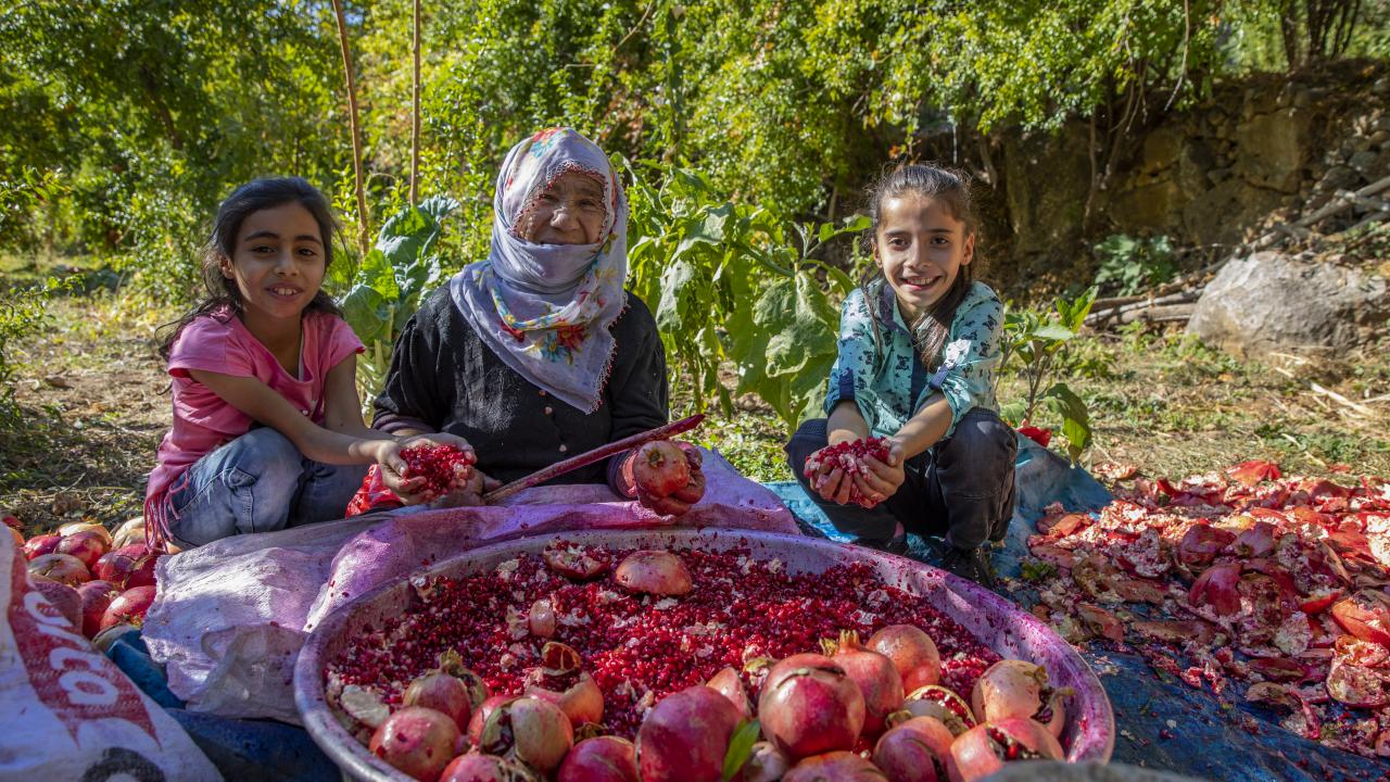 Kadın ve çocukların da yer aldığı hasatta narlar tek tek elle toplanıyor.