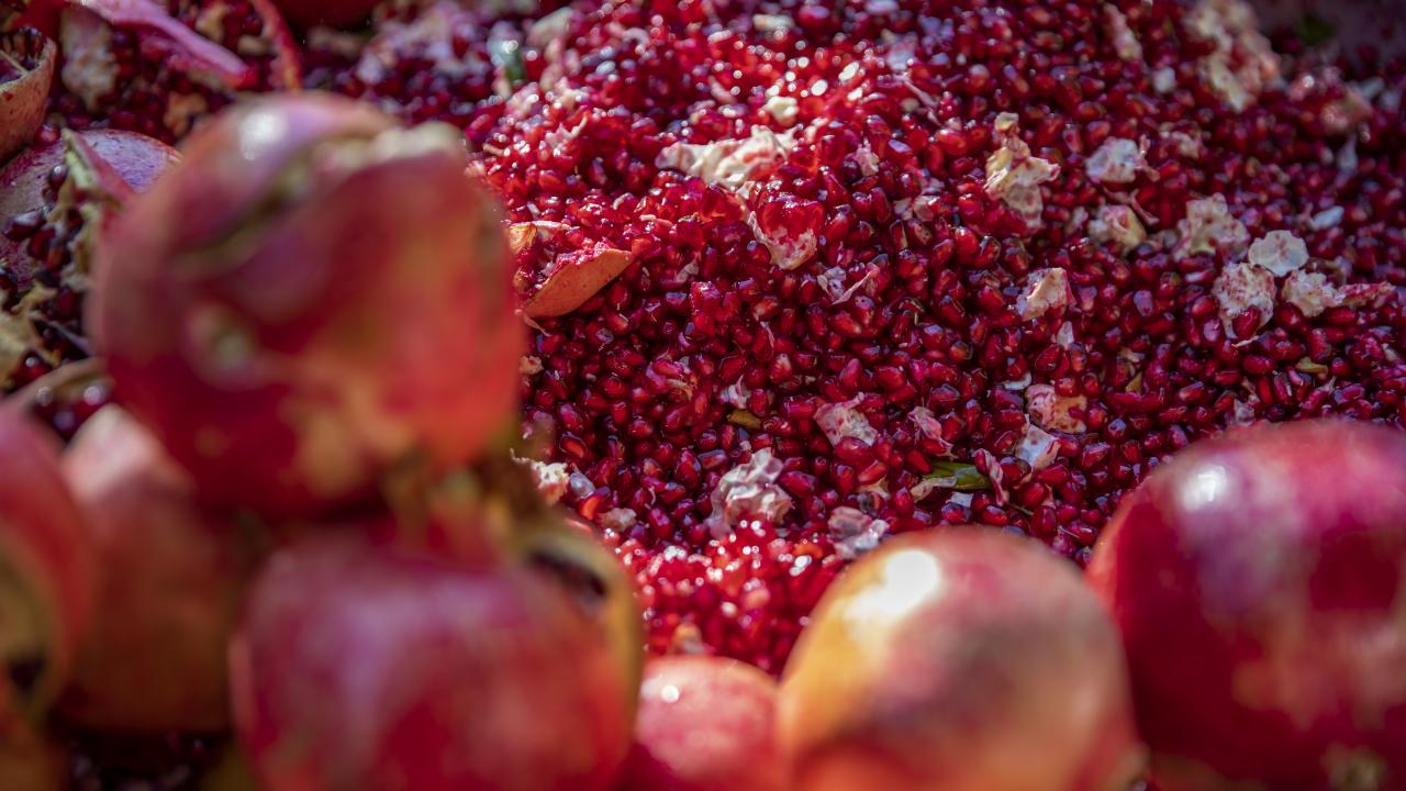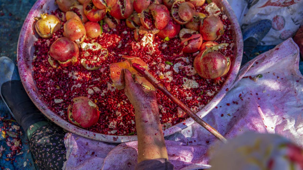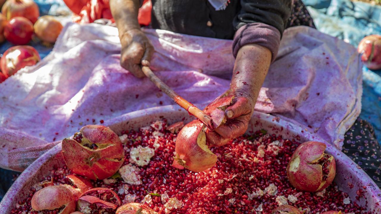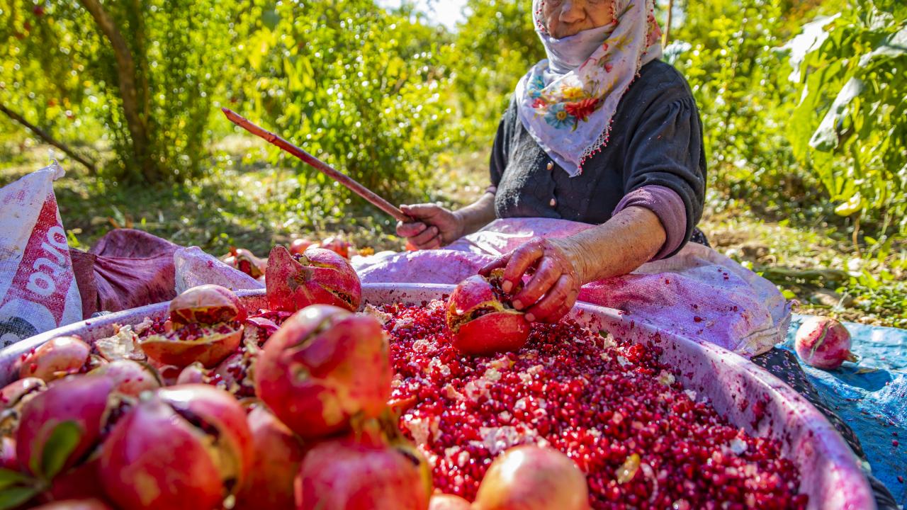 Çatlayan narlar kadınlar tarafından değneklerle dövülerek nar ekşisi yapımı için hazır hale getiriliyor.