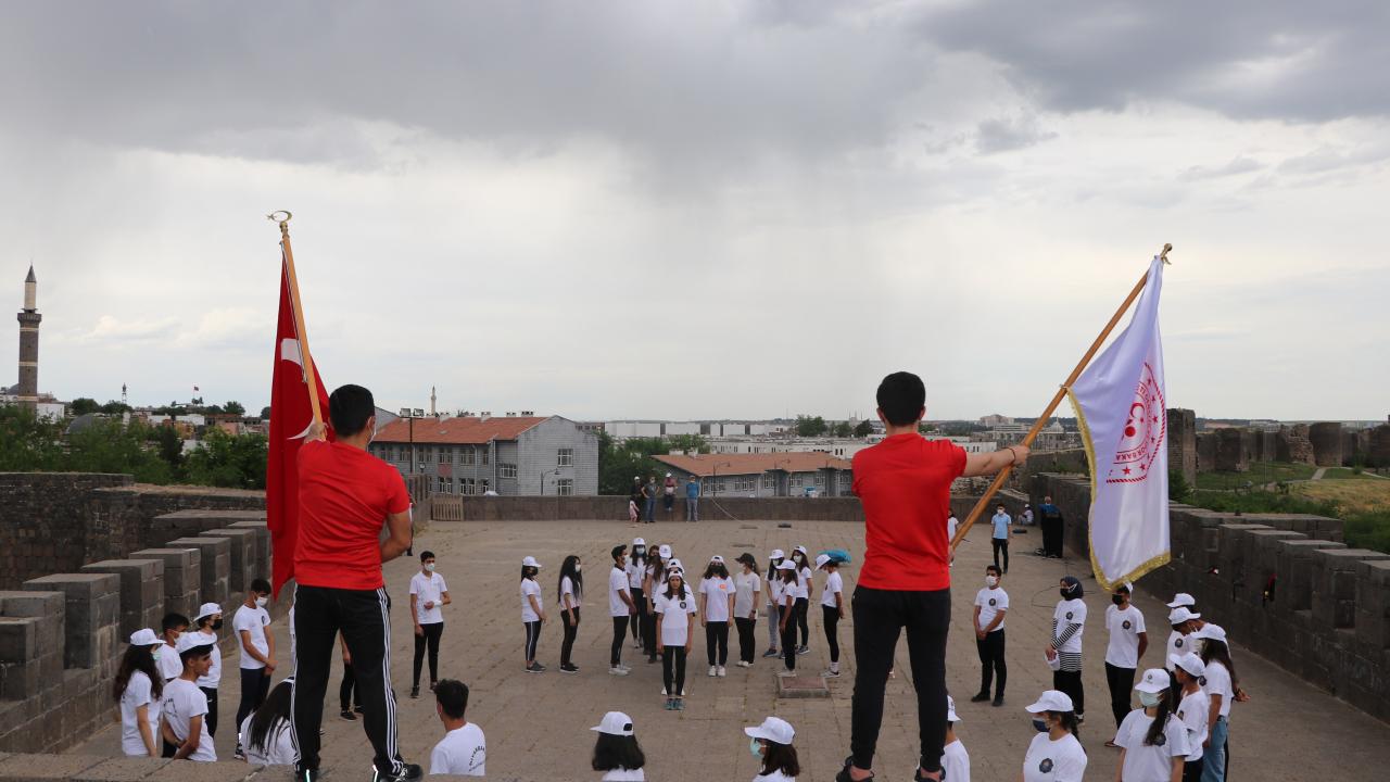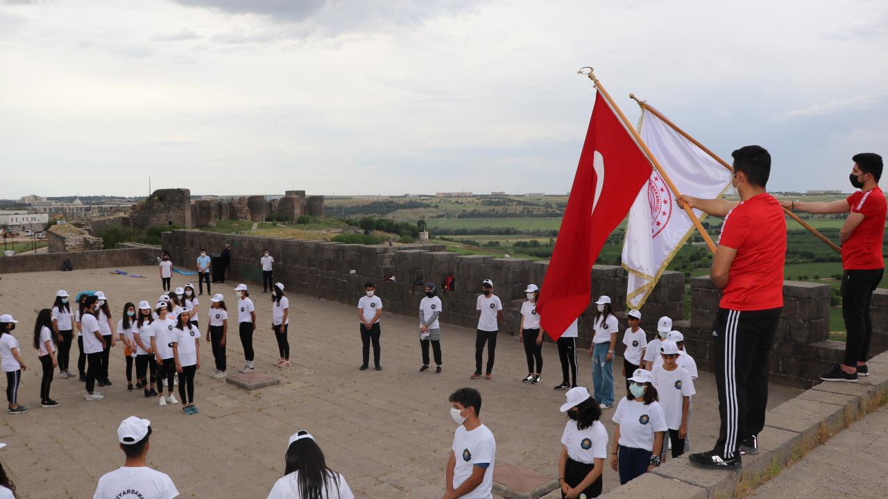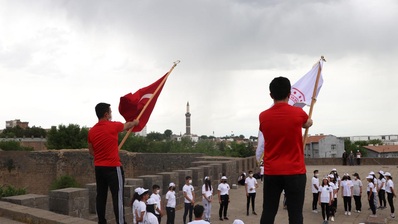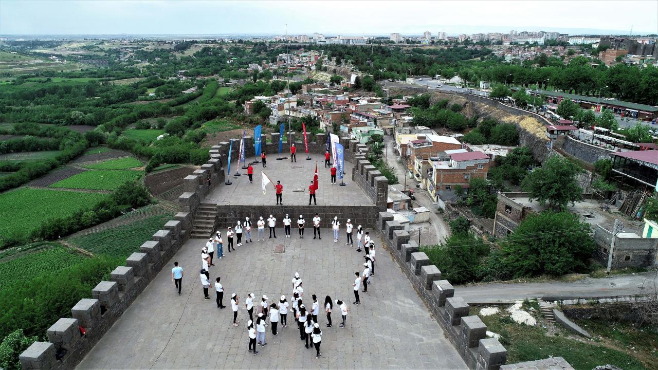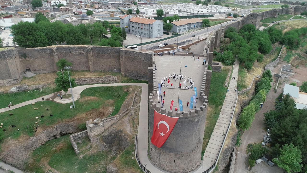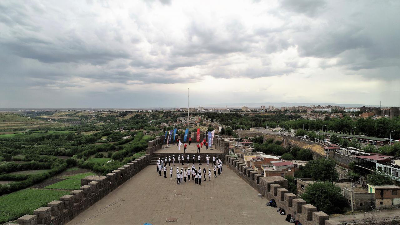 Diyarbakır'da çeşitli branşlardaki 40 genç sporcu, 19 Mayıs Atatürk'ü Anma, Gençlik ve Spor Bayramı etkinlikleri kapsamında 5 bin yıllık tarihi surlarda, 'ay yıldız' koreografisi oluşturarak, İstiklal Marşı okudu.