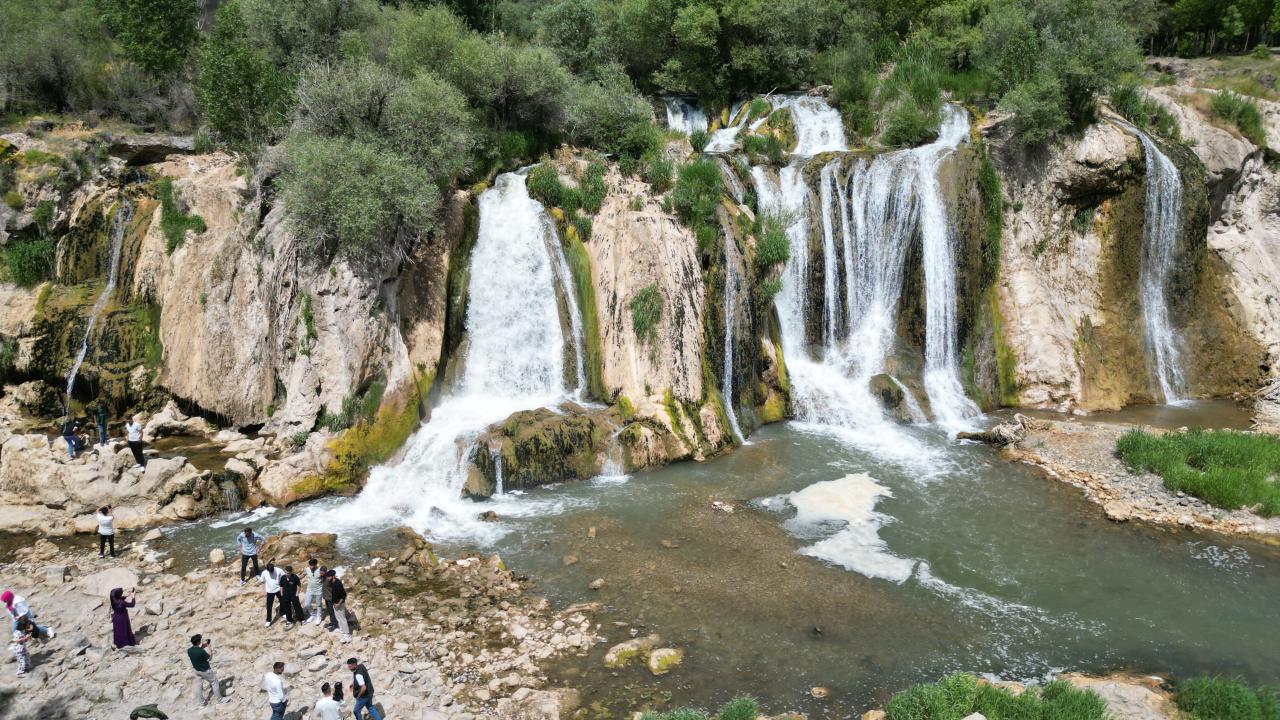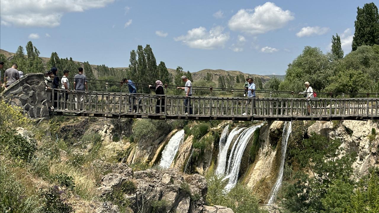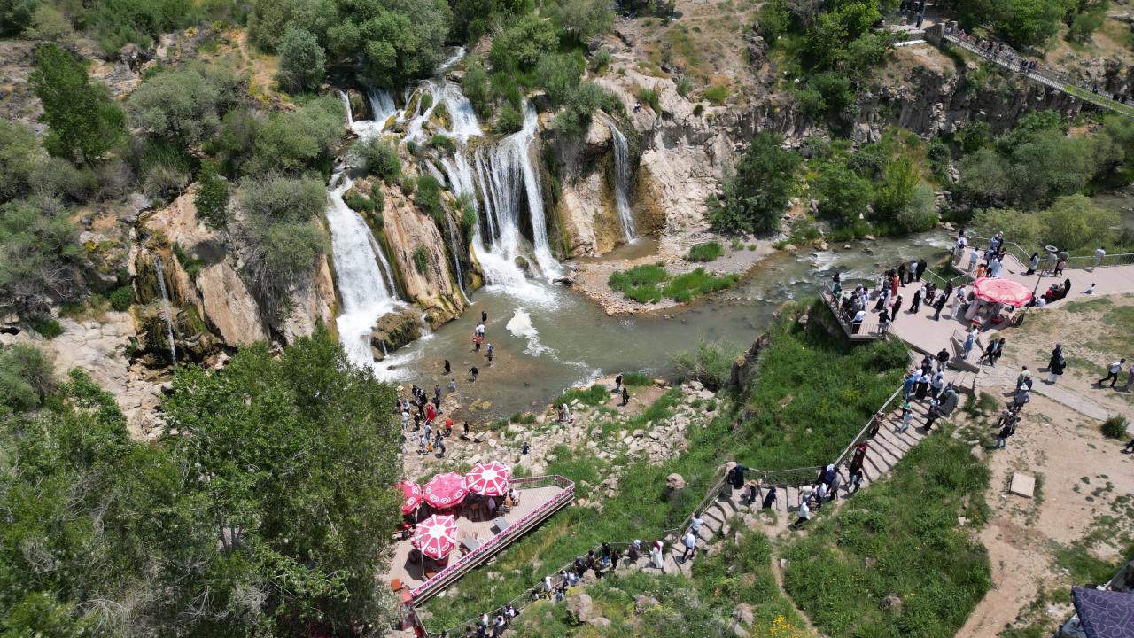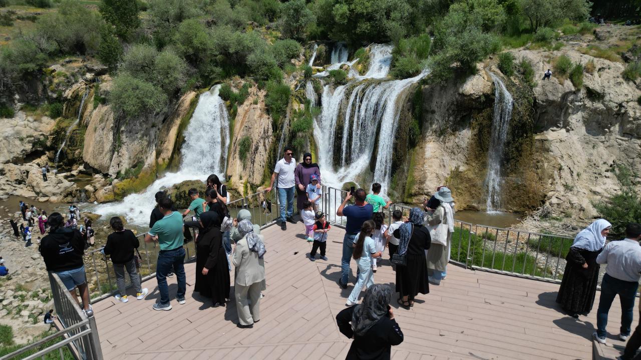 Metrelerce yükseklikten akan suyuyla ziyaretçilerin ilgi odağı olan şelale, Kurban Bayramı tatilini fırsat bilenlerin de uğrak noktası oldu.