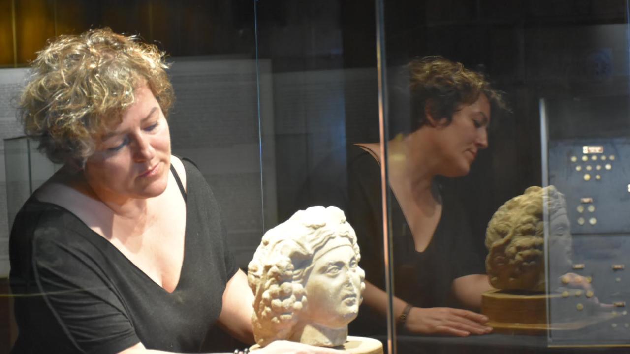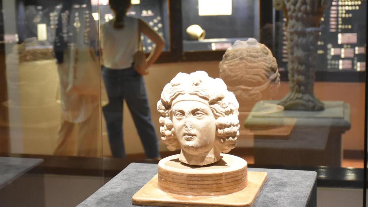 Saçları ortadan ayrık, burnu kırık, sağ kaşında zedelenmeler olan 20 santimetre uzunluğundaki eser, fuayede cam fanusta yer aldı.