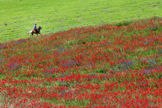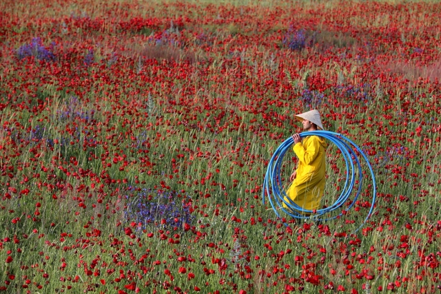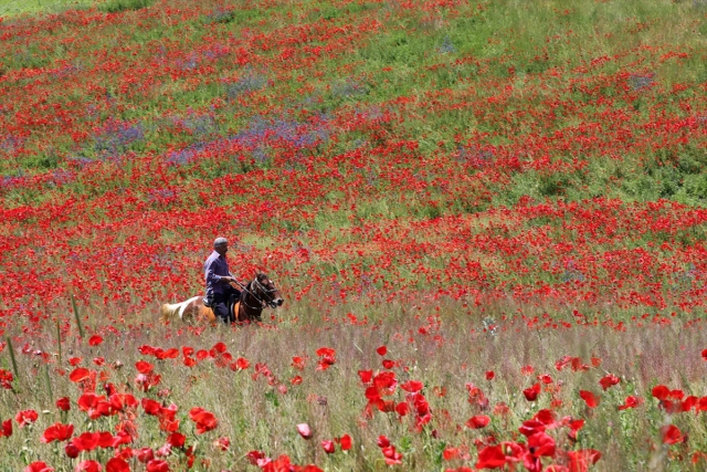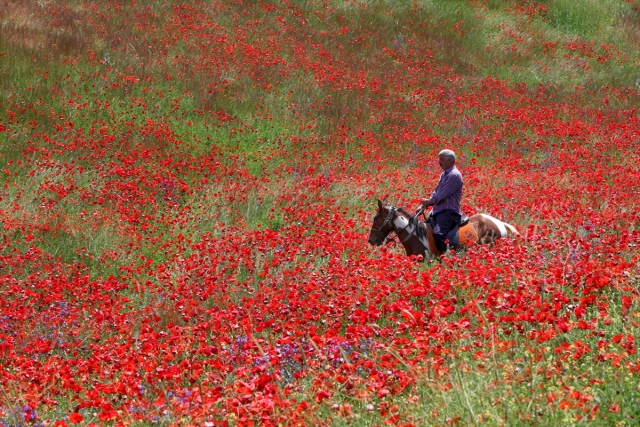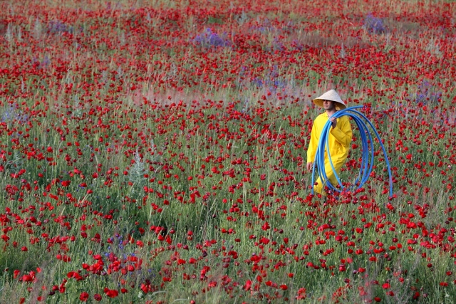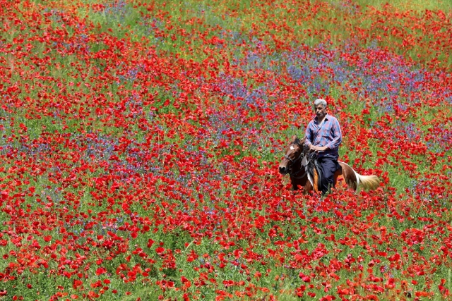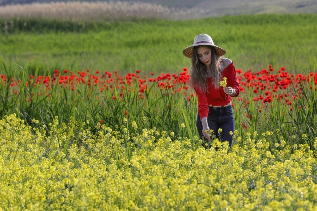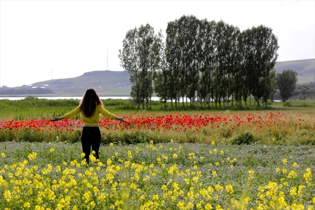 Van Erciş kara yolu güzergahında bulunan boş tarlalarda açan gelincikler ve sarı mor çiçekler görsel şölen sunuyor.