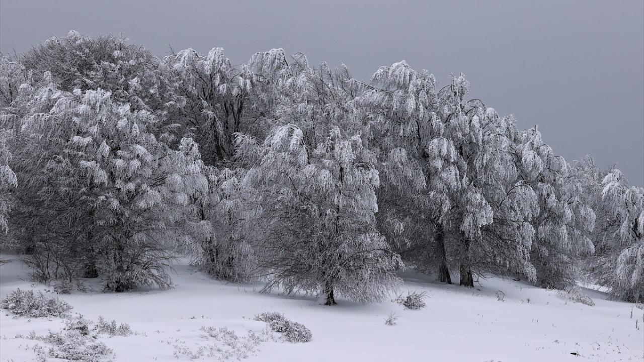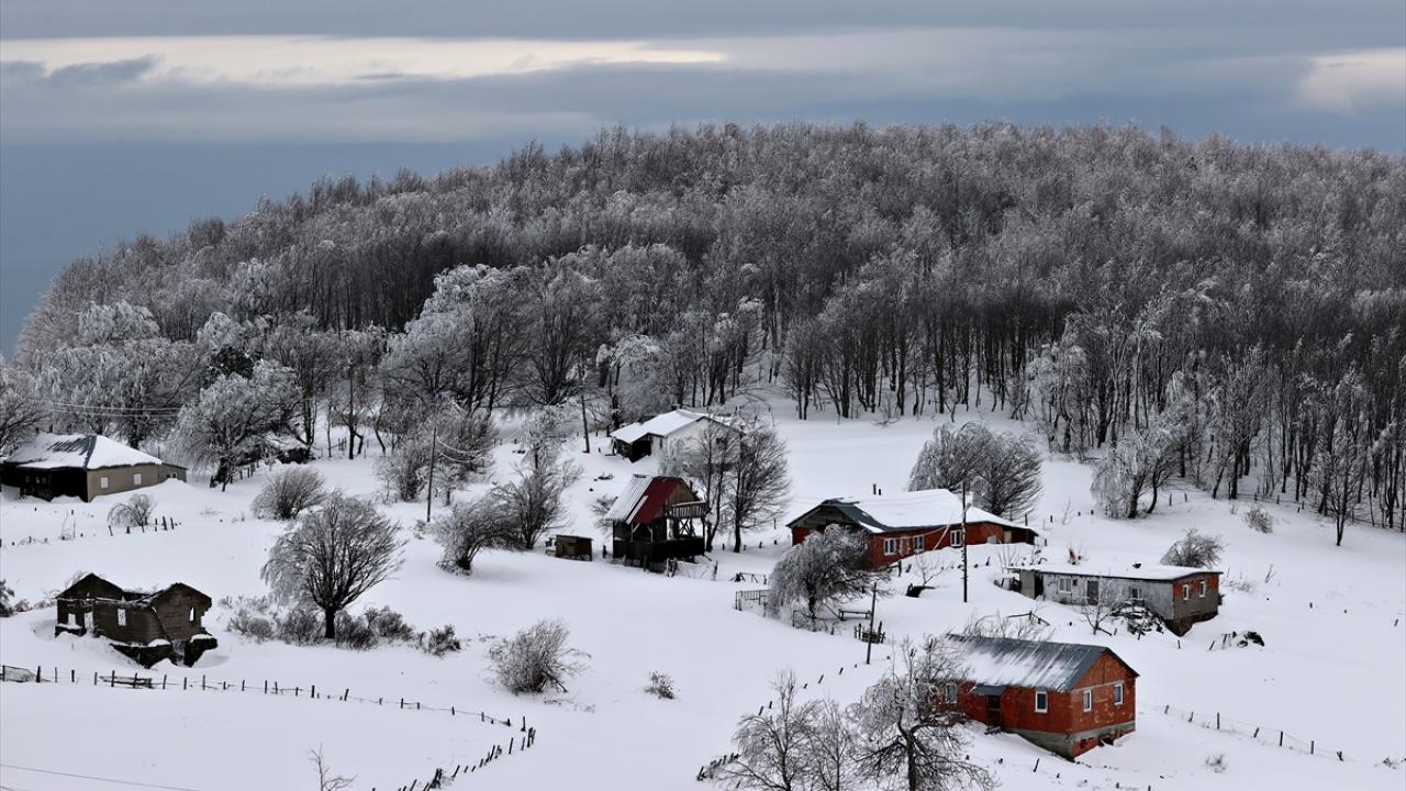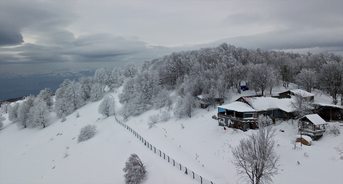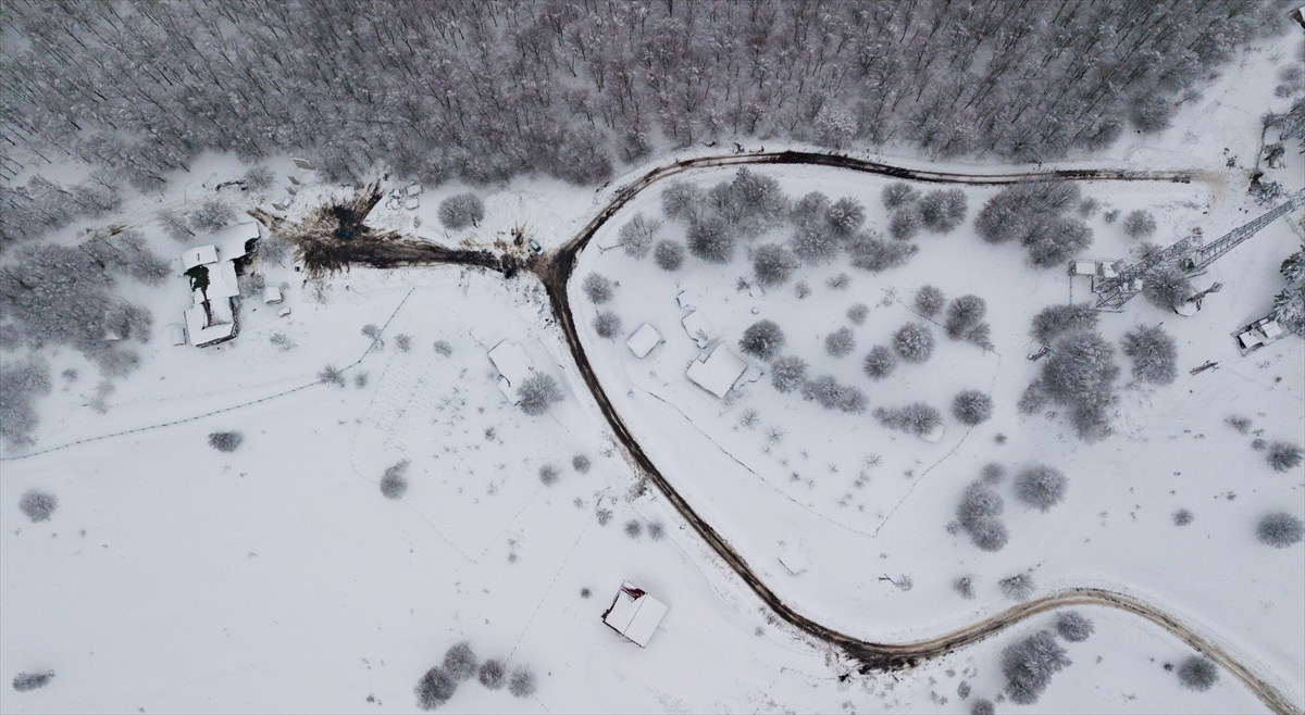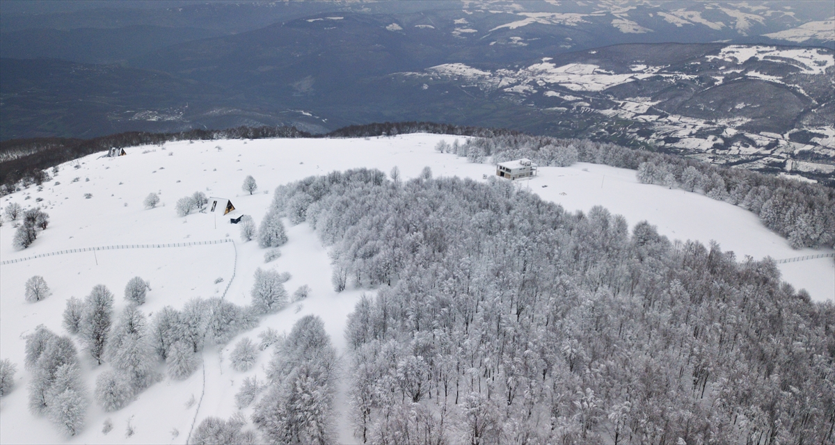 Kar yağışının ardından etkileyici güzelliğe bürünen Kocadağ Yaylası, dronla görüntülendi.
