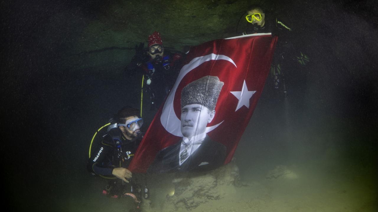 Mağaraya dalan dalgıçlar, su altında Mustafa Kemal Atatürk`ün resminin olduğu Türk bayrağı da açtı.