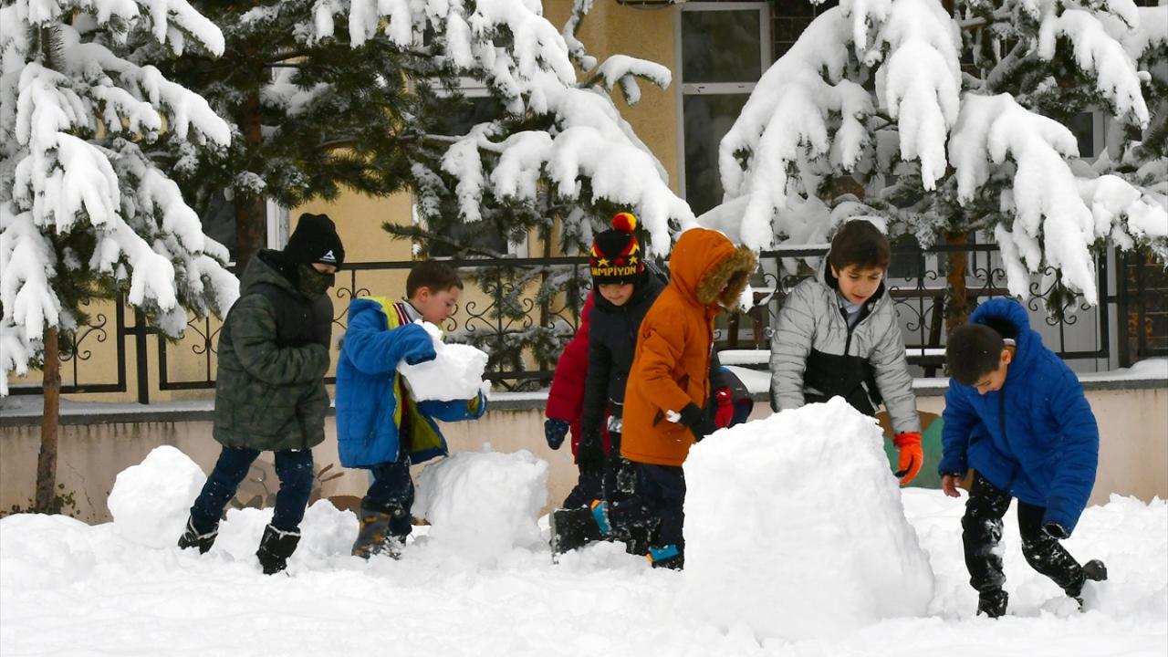Kar yağışına sevinen çocuklar, okul bahçesinde kar topu oynadı, kardan adam yaptı.