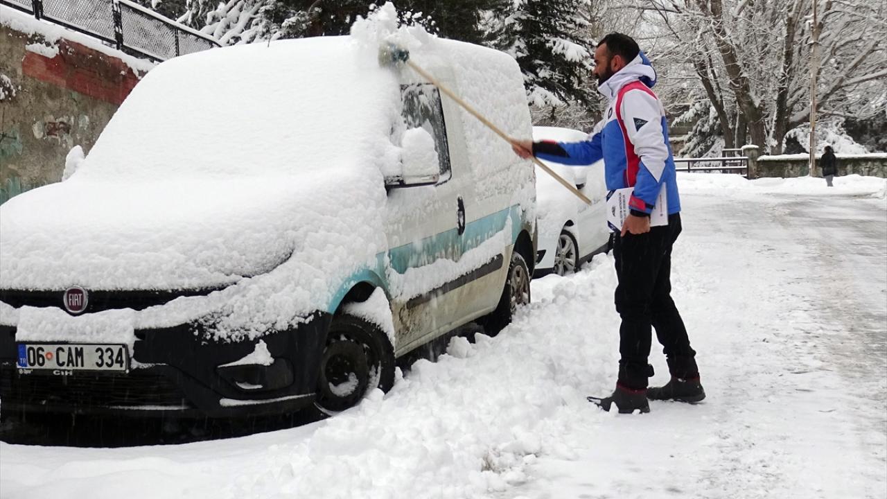 Vatandaşlar araçlarının üzerinde biriken karları temizledi.
