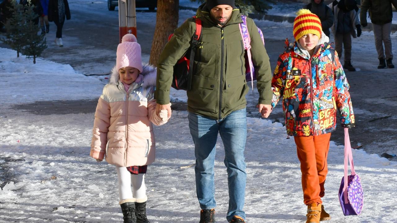 Süphan Dağı’nın beyaza büründüğü kentte, Diyadin ilçesinde öğrenciler okul bahçesinde kar topu oynadı.