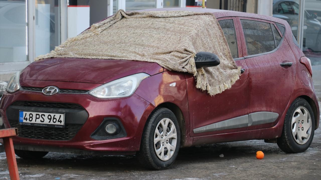 Çatılarda buz sarkıtlarının oluştuğu kentte, bazı vatandaşlar araçlarının üzerine yorgan, branda ve battaniye örterek soğuktan korumaya çalıştı.