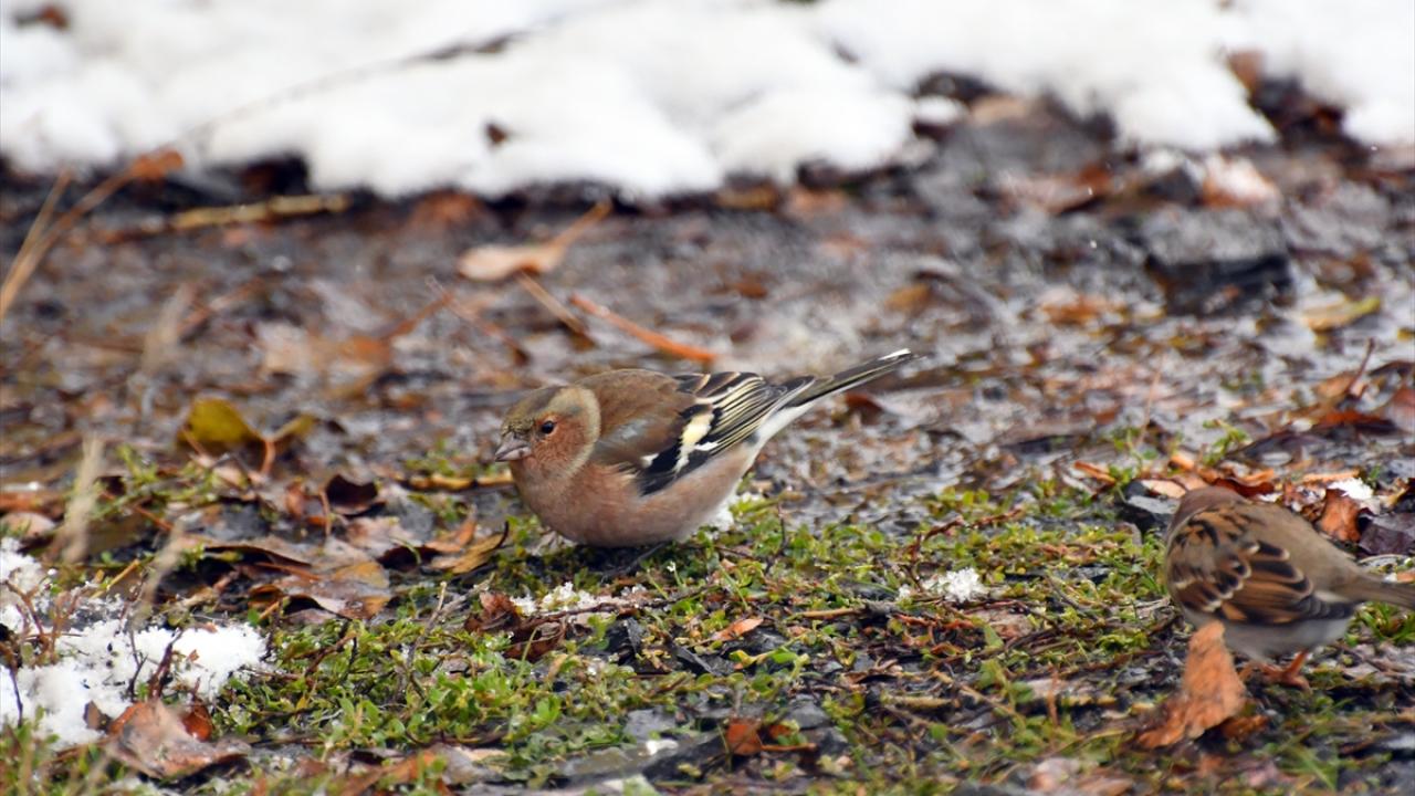 Kuşların soğuk havada yiyecek bulmaya çalışması arazide görüntülendi.