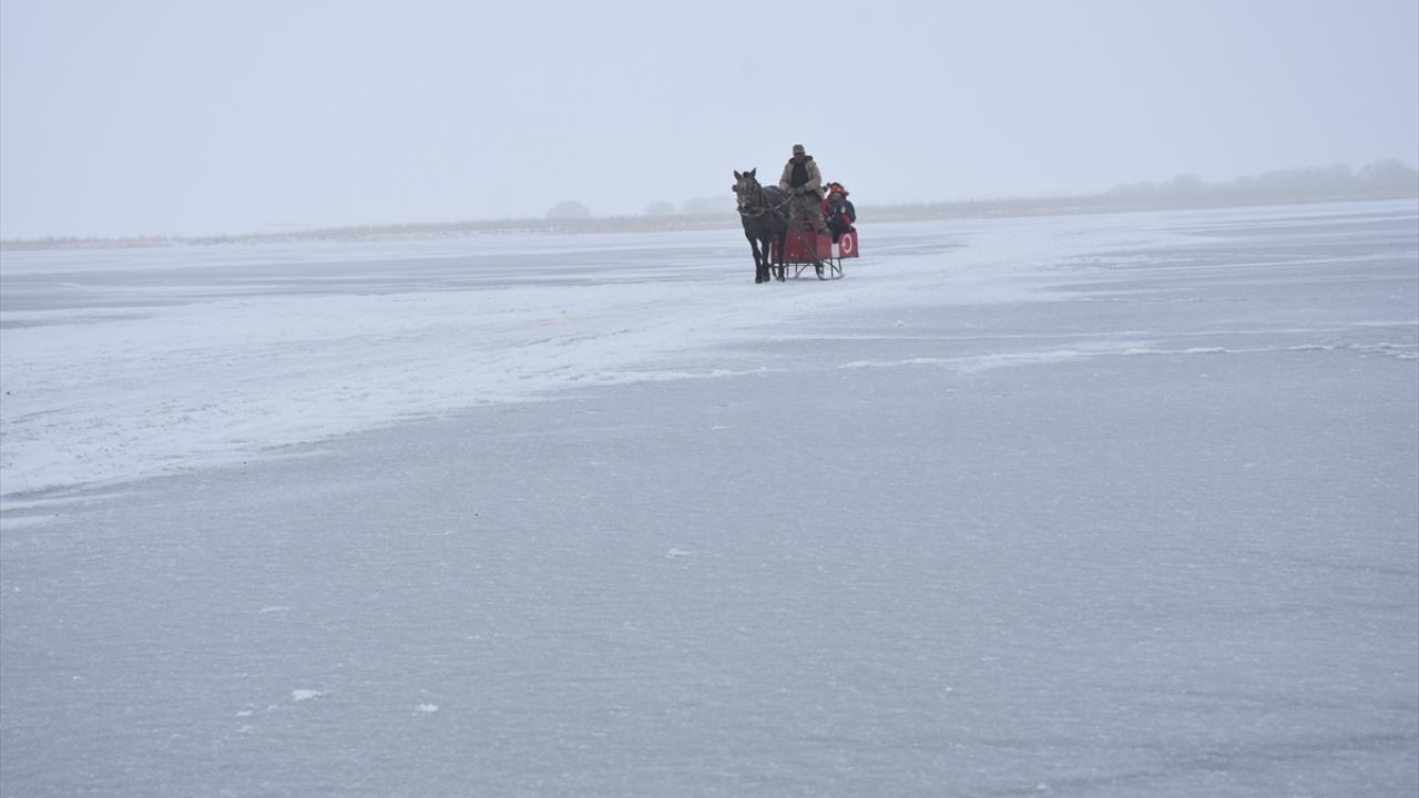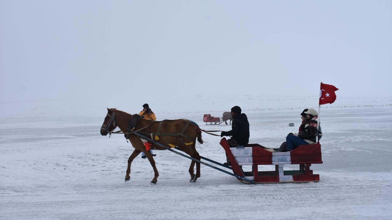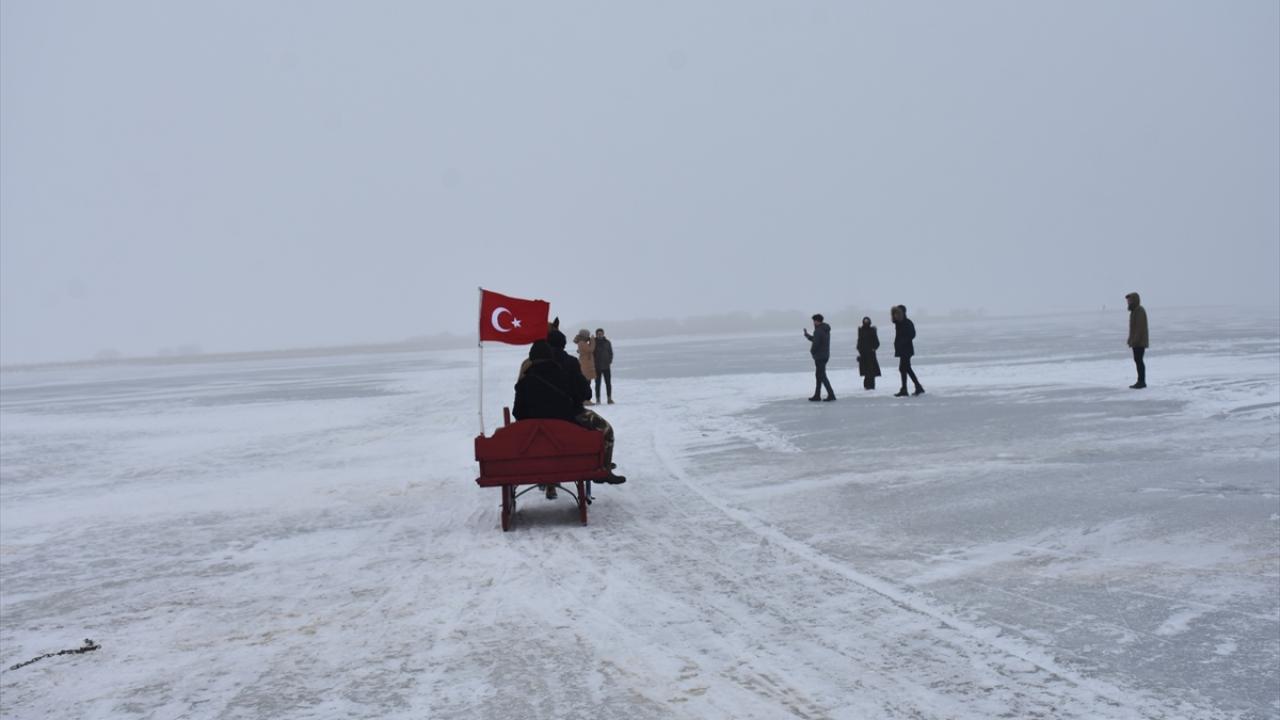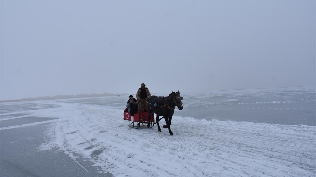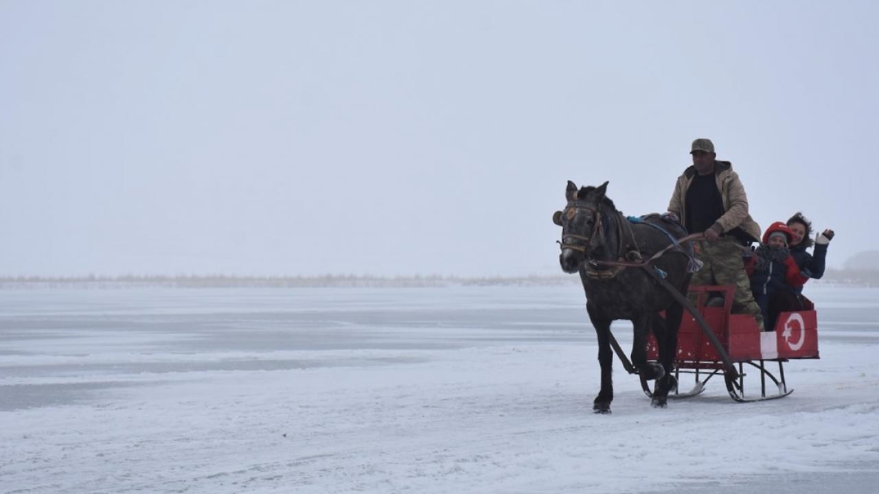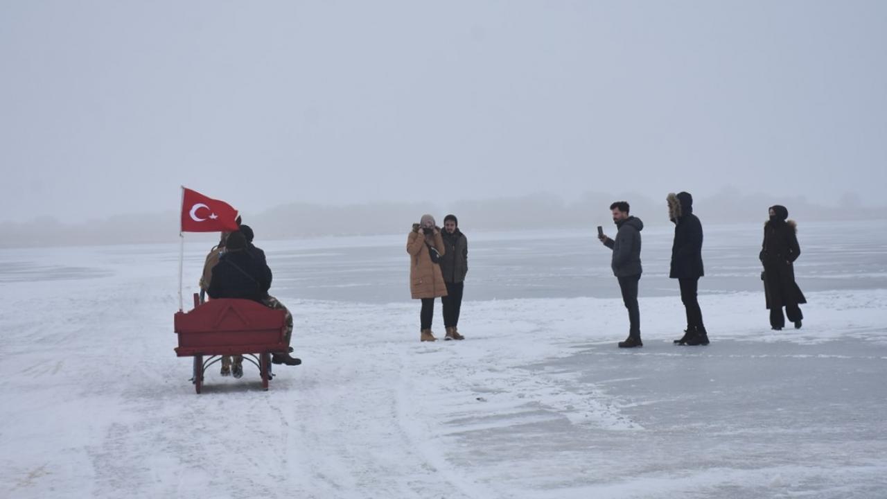 Kış mevsiminde donan Kars-Ardahan sınırındaki göl, Arpaçay ilçesine bağlı Taşbaşı köyü mevkiinde soğuk ve sise rağmen yerli ve yabancı turistleri ağırlıyor.