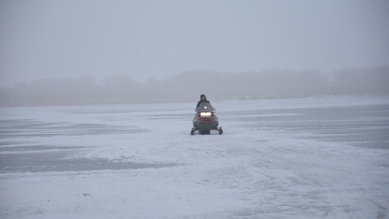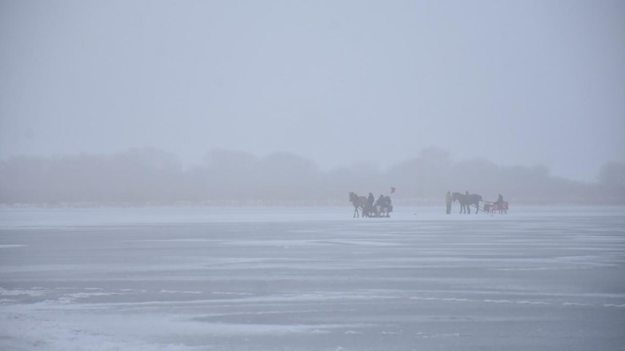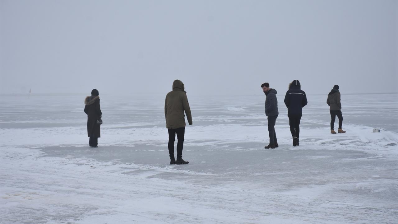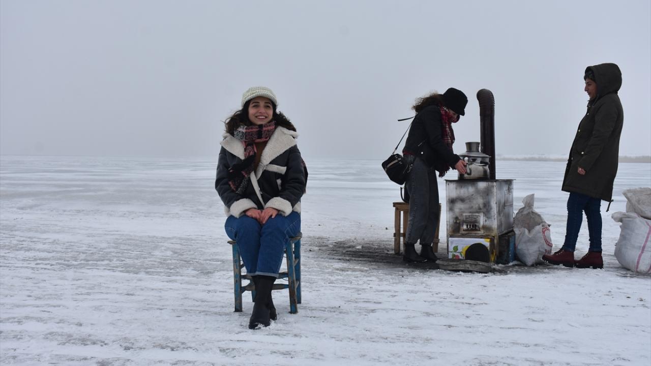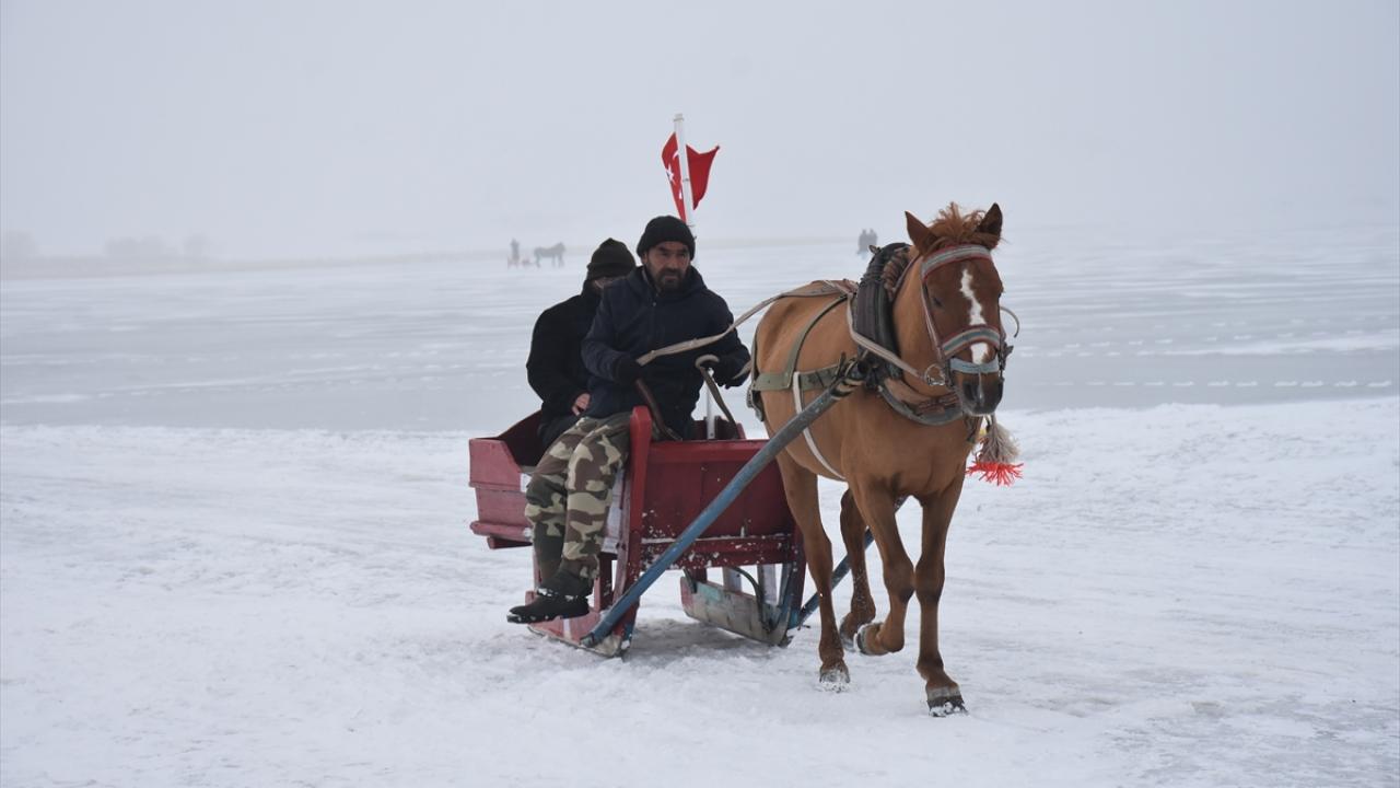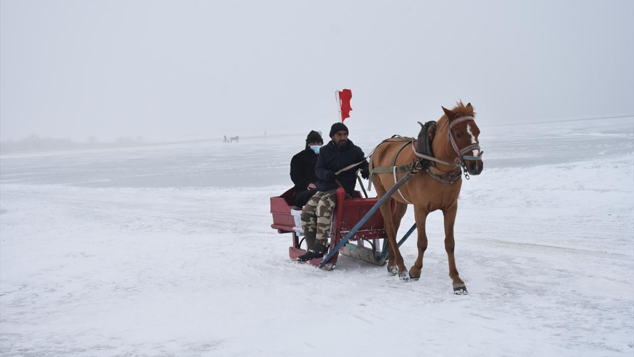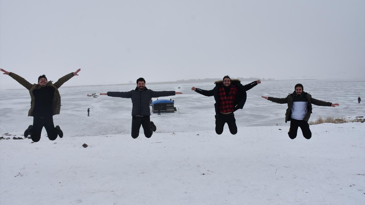 Kış mevsiminde donan Kars-Ardahan sınırındaki göl, Arpaçay ilçesine bağlı Taşbaşı köyü mevkiinde soğuk ve sise rağmen yerli ve yabancı turistleri ağırlıyor.