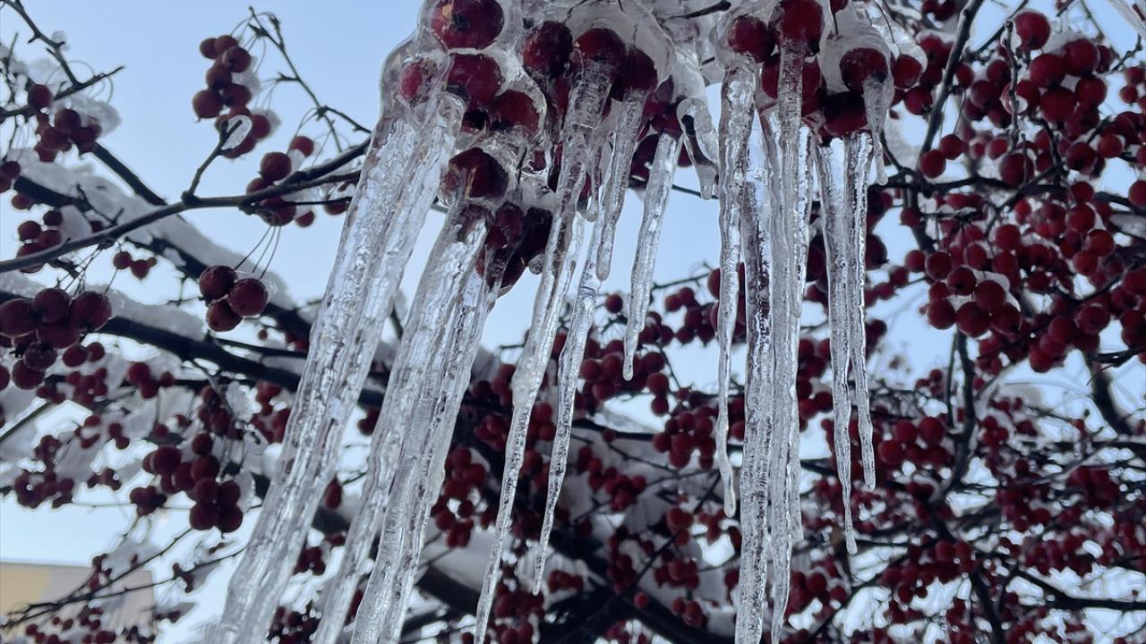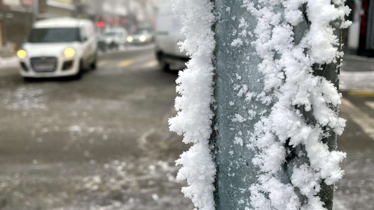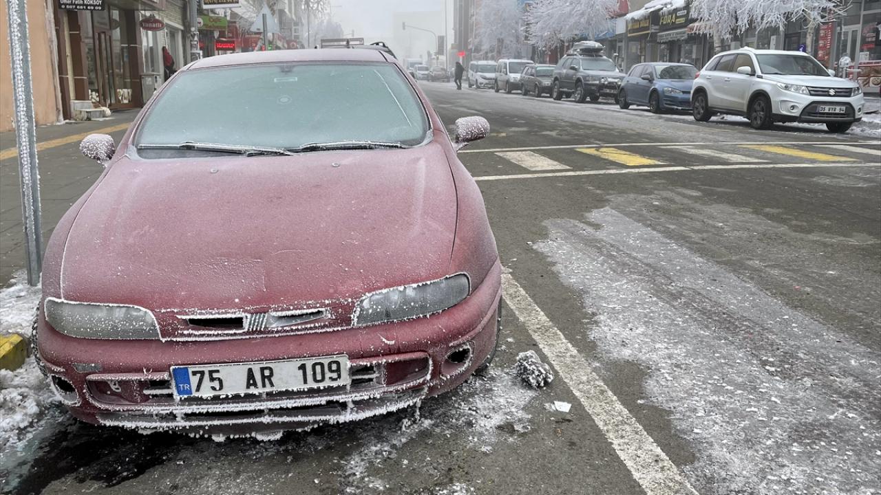 Doğu Anadolu Bölgesi'nde dondurucu soğuklar nedeniyle yol ve kaldırımlarda buzlanma oluşurken, ağaç ve yaprakları kırağı ile kaplandı.