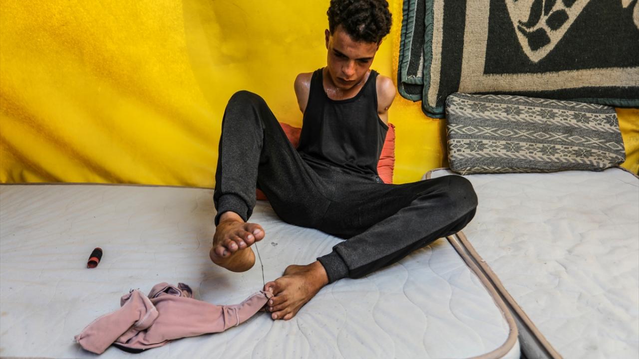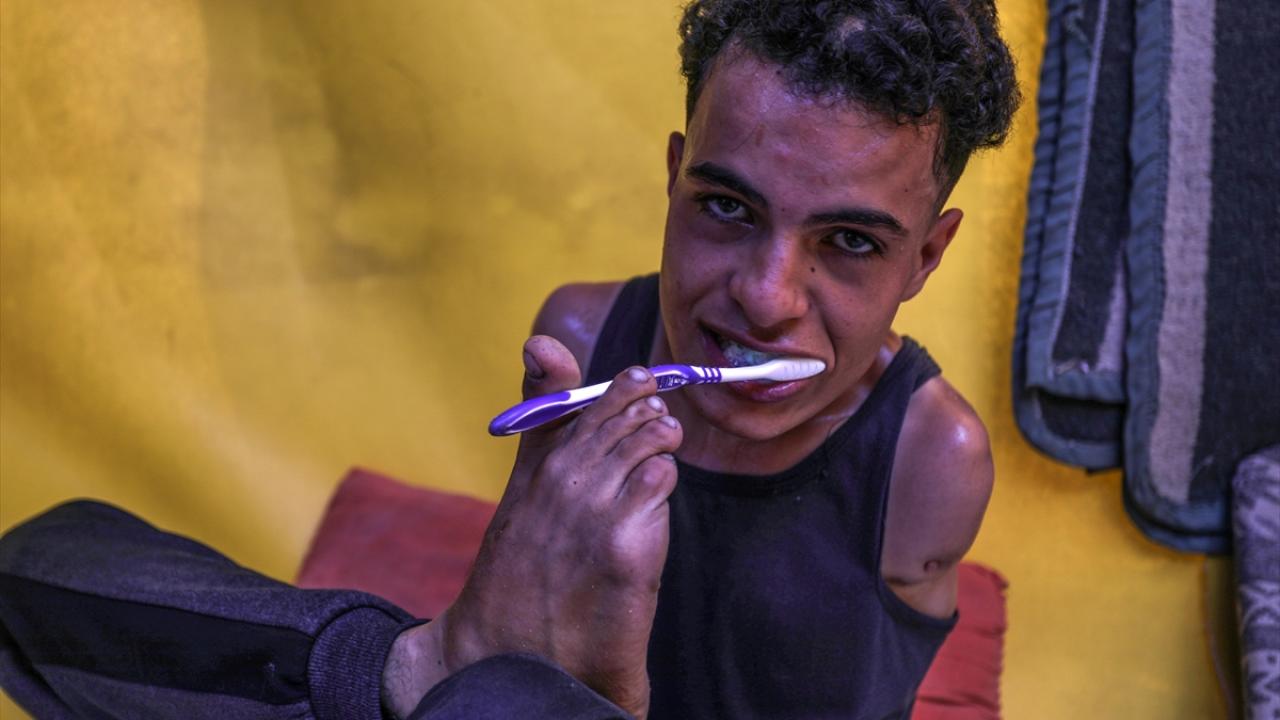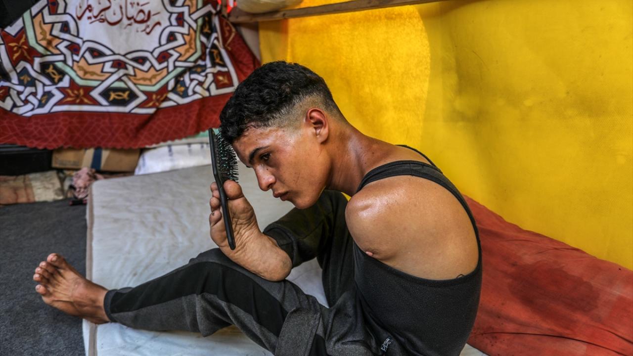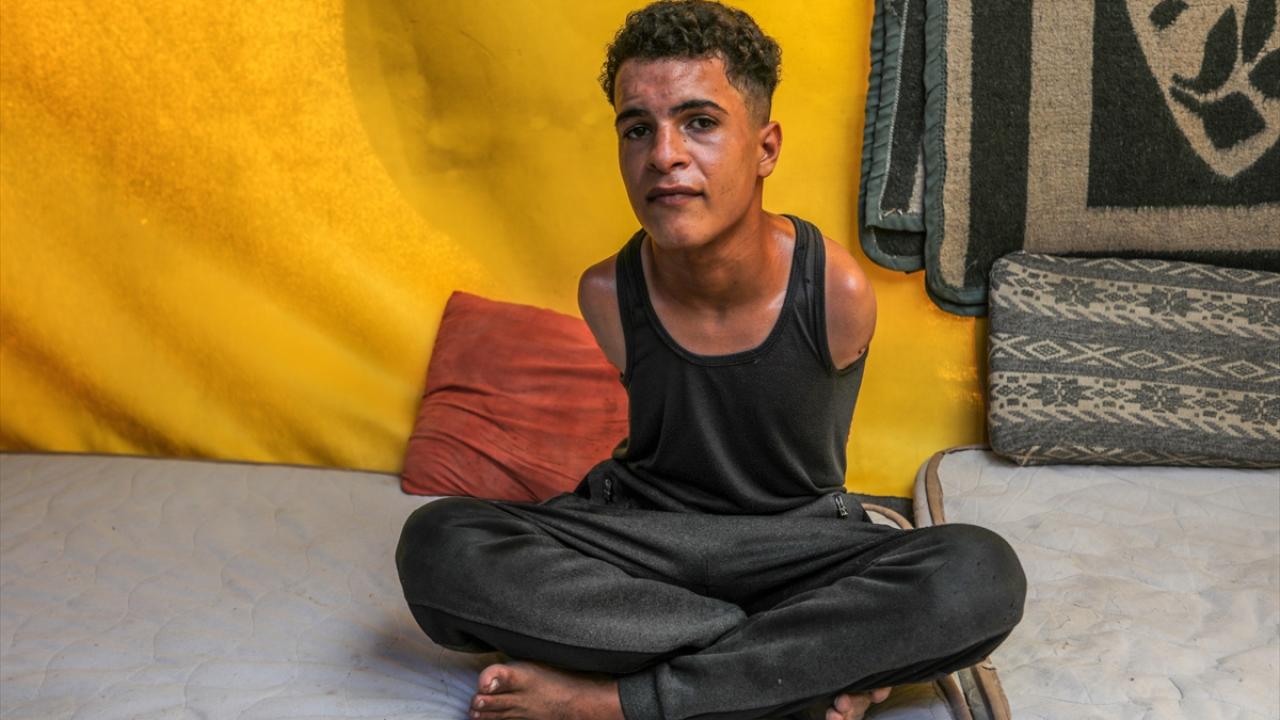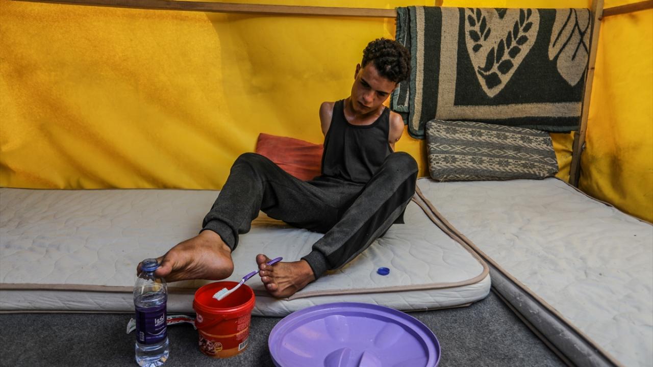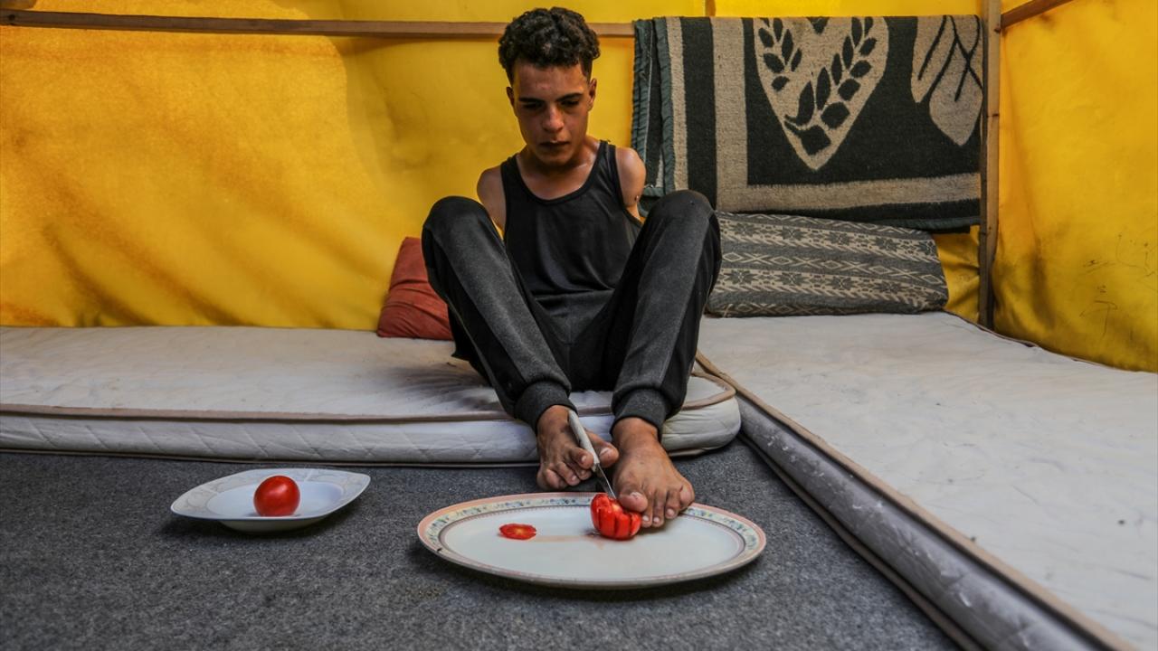 İsrail saldırıları nedeniyle Gazze Şeridi'nin kuzeyindeki Deyr Lahya kentinden ailesiyle birlikte Deyr Belah'a göç eden doğuştan kolları olmayan 17 yaşındaki Filistinli Osama Abu Moawad, derme çatma bir çadırda yaşamını sürdürüyor.