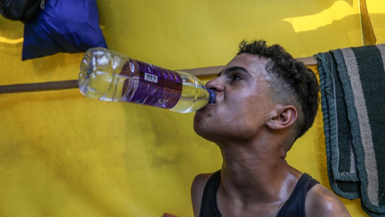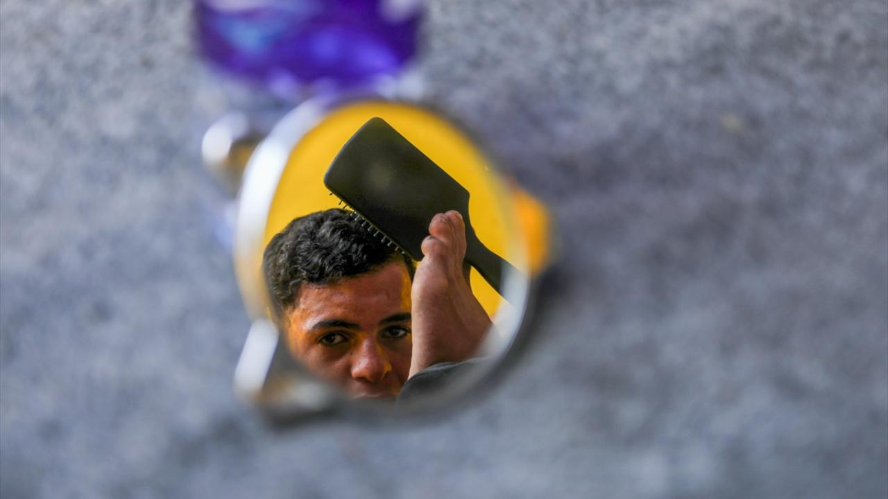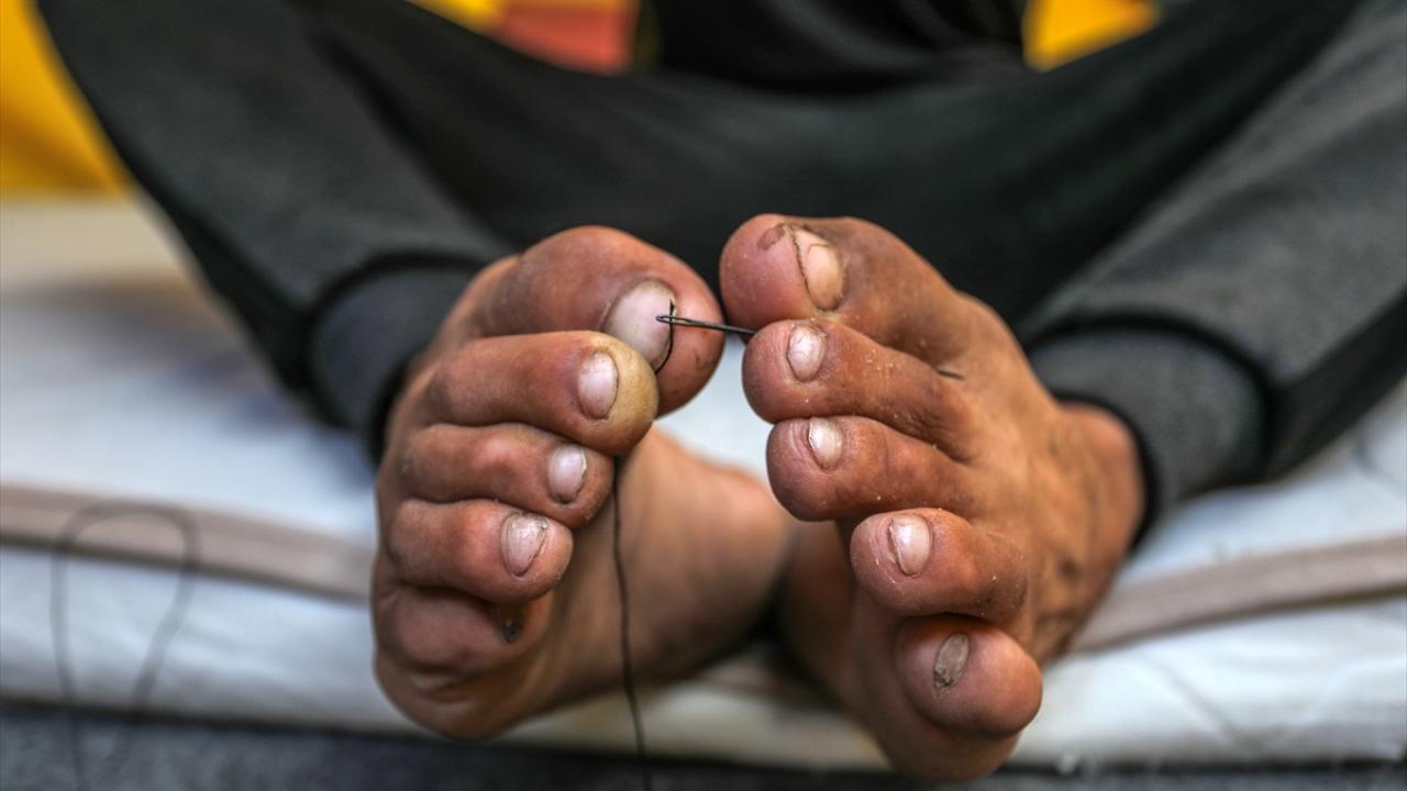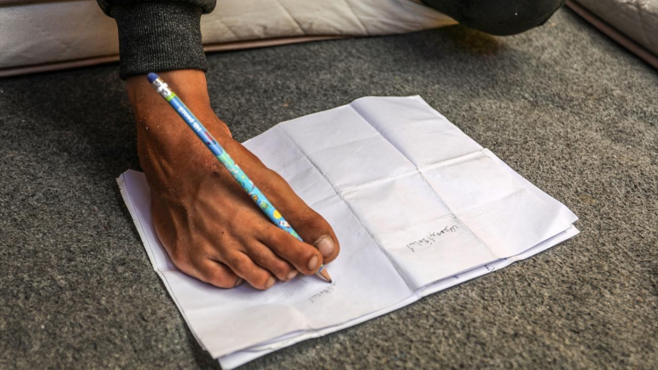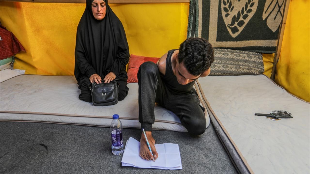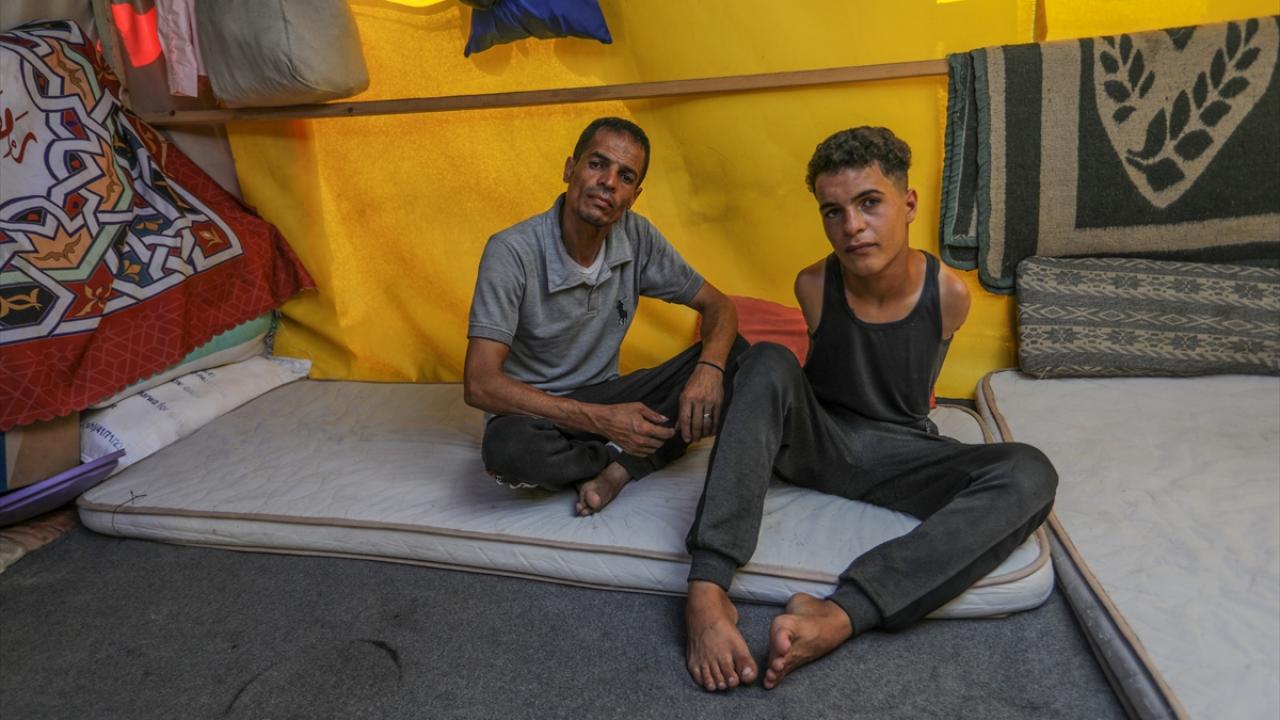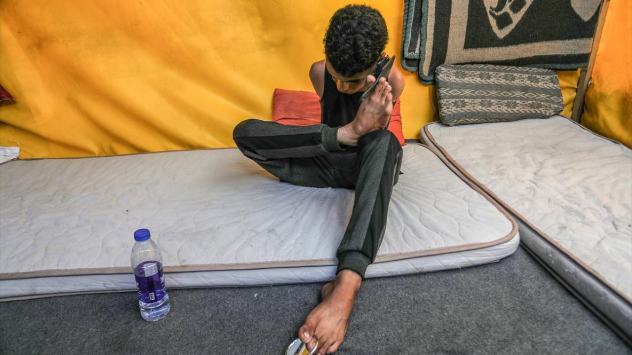 İsrail saldırıları nedeniyle Gazze Şeridi'nin kuzeyindeki Deyr Lahya kentinden ailesiyle birlikte Deyr Belah'a göç eden doğuştan kolları olmayan 17 yaşındaki Filistinli Osama Abu Moawad, derme çatma bir çadırda yaşamını sürdürüyor.