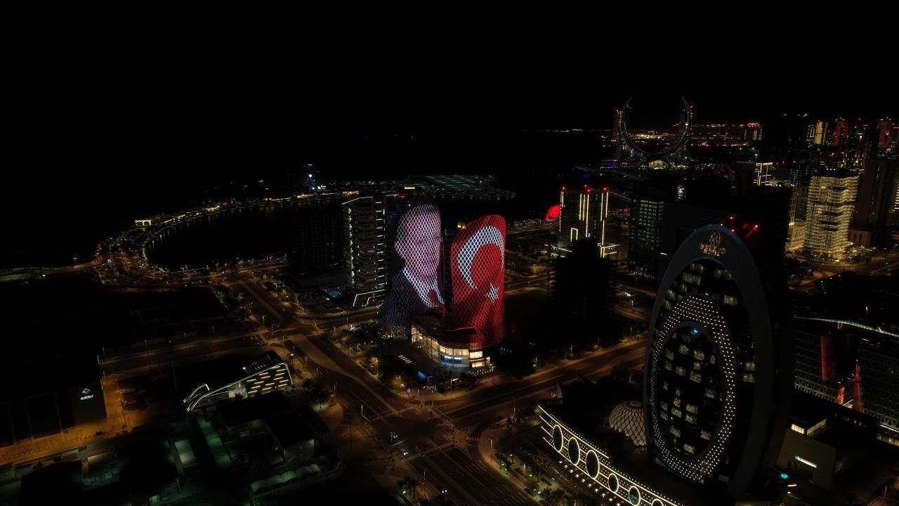 Doha'da Cumhurbaşkanı Erdoğan'ın fotoğrafı ve Türk bayrağı kulelere yansıtıldı
