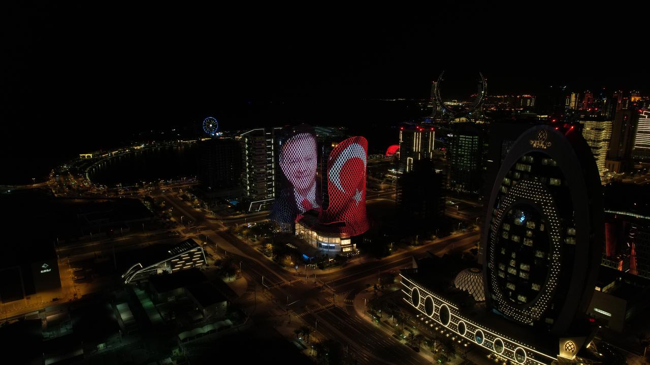 Doha`daki Lusail bölgesinde bulunan Al Jaber Kuleleri`ne Cumhurbaşkanı Recep Tayyip Erdoğan’ın fotoğrafını ve Türk bayrağı yansıtıldı.