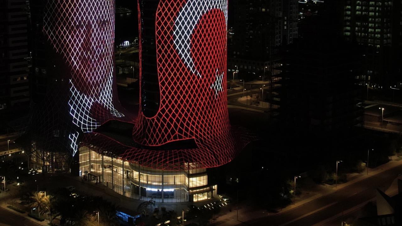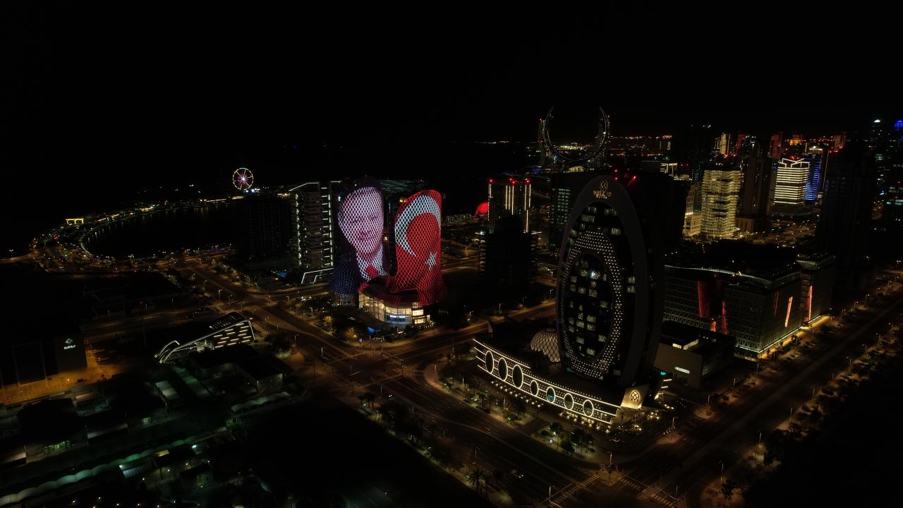 Katar'ın başkenti Doha'daki Al Jaber Kuleleri'ne Cumhurbaşkanı Erdoğan’ın fotoğrafı ve Türk bayrağı yansıtıldı.