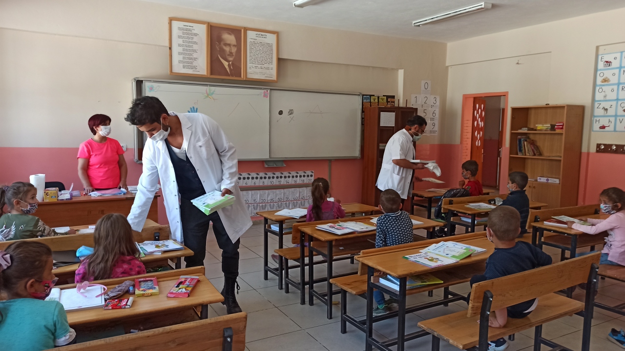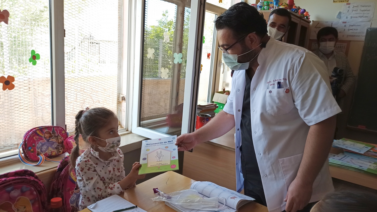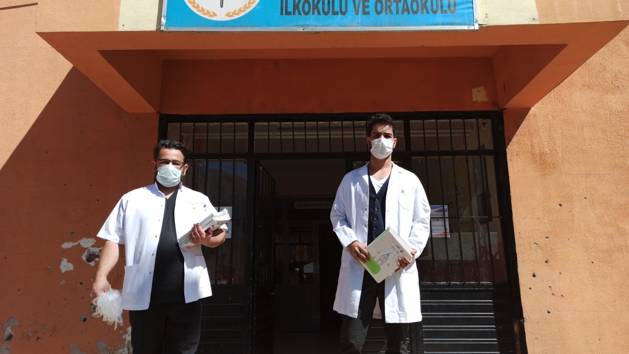 Bitlis’te yeni tip koronavirüs ile mücadele eden doktorlar köy köy dolaşıp öğrencilere kitap dağıtıp, koronavirüs hakkında bilgilendirme yapıyor.