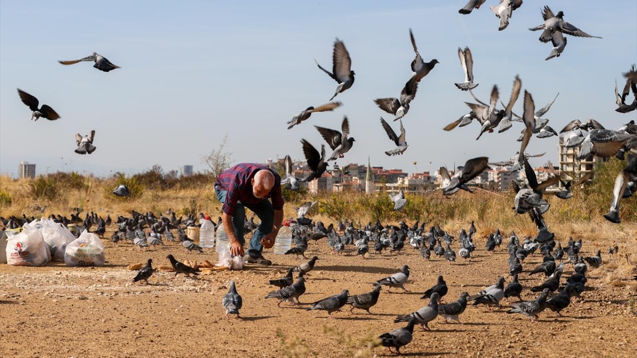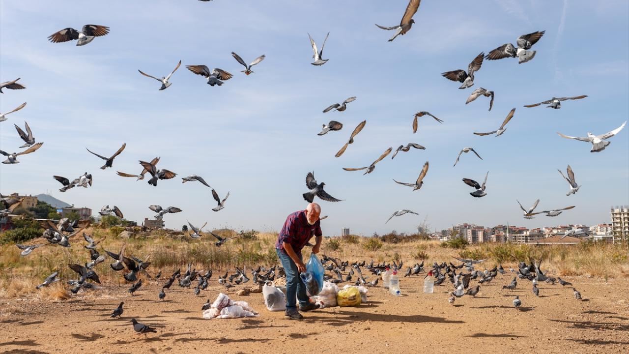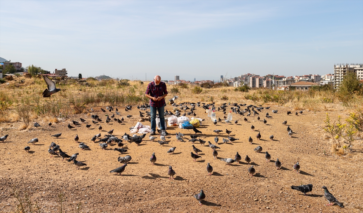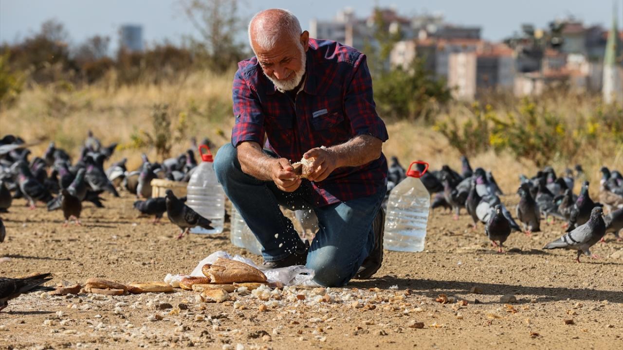 Günlük yürüyüşü esnasında sokak sokak dolaşıp çöplerin yanına bırakılan ekmekleri toplayan Osman Güler, daha sonra Tahsin Yazıcı Mahallesi`ndeki evinin önüne gidiyor. Ekmekleri ufalayıp onlarca güvercini besleyip onlara su da veren Güler, evinin önündeki boş araziyi kuşların beslenme alanına dönüştürdü.