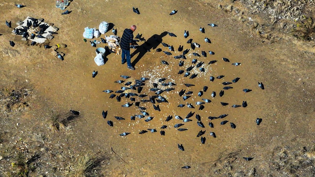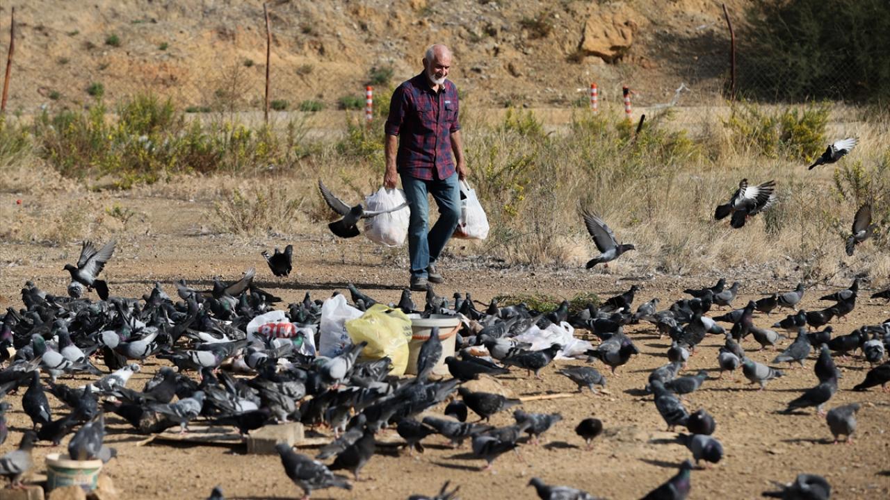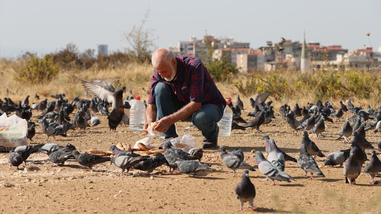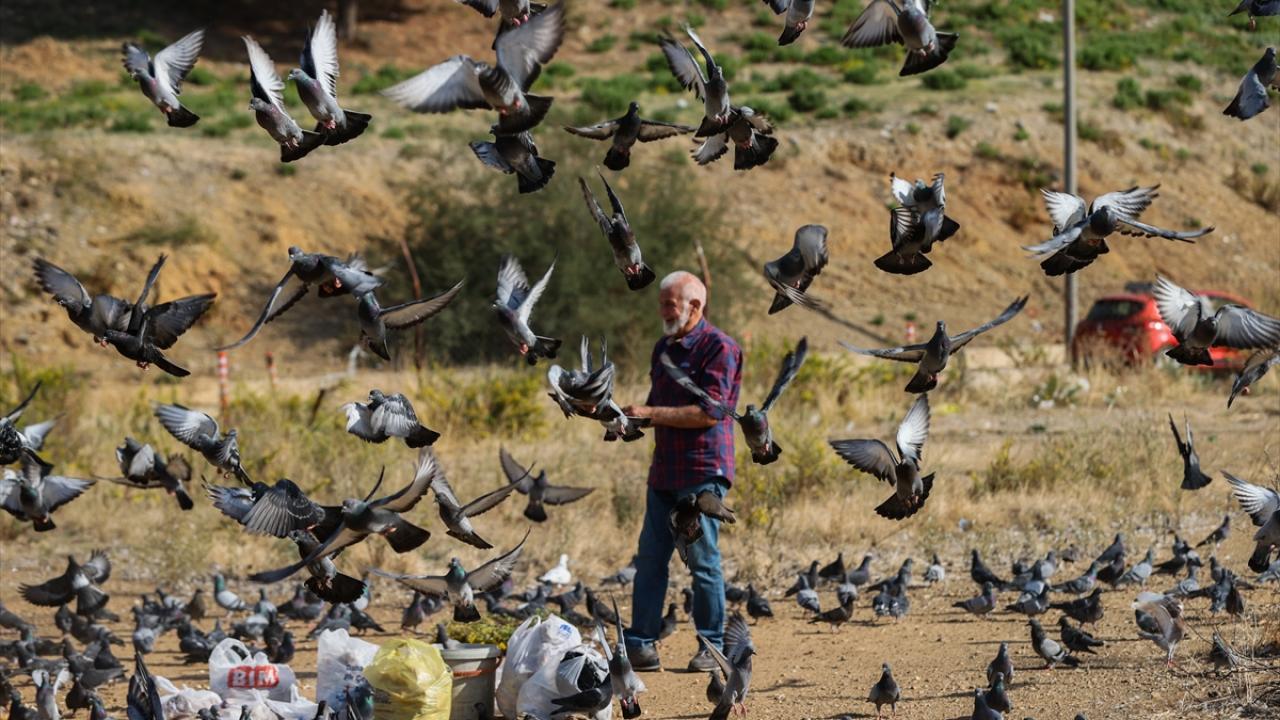 Günlük yürüyüşü esnasında sokak sokak dolaşıp çöplerin yanına bırakılan ekmekleri toplayan Osman Güler, daha sonra Tahsin Yazıcı Mahallesi`ndeki evinin önüne gidiyor. Ekmekleri ufalayıp onlarca güvercini besleyip onlara su da veren Güler, evinin önündeki boş araziyi kuşların beslenme alanına dönüştürdü.