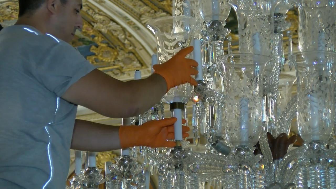 42 kollu kristal şamdanların bakımı düzenli yapılıyor