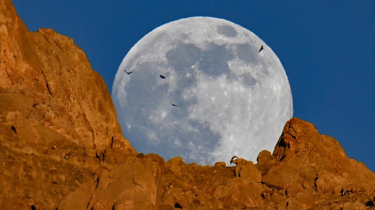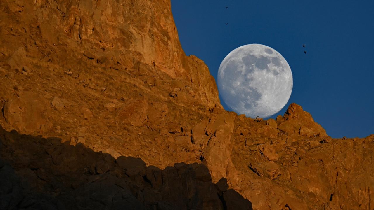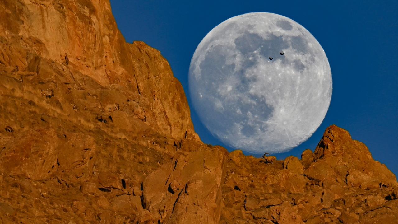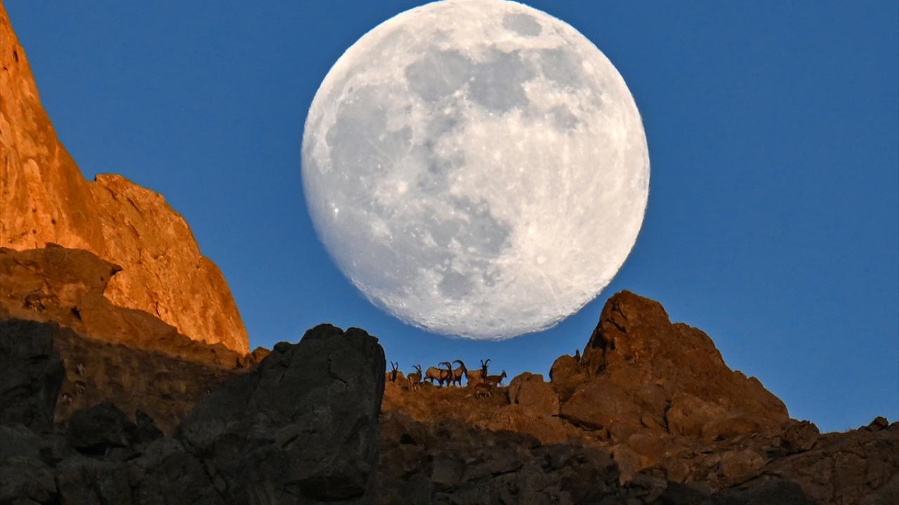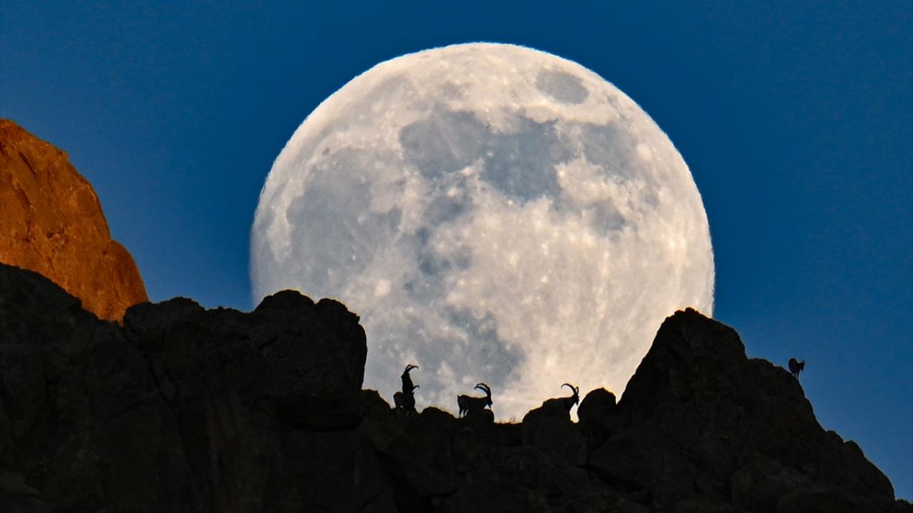 Van`ın Gürpınar ilçesinde nesli koruma altındaki yaban keçileri, dağın arkasından yükselen dolunayla birlikte görüntülendi.