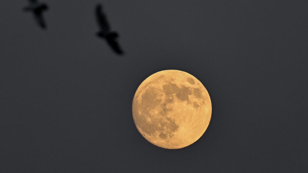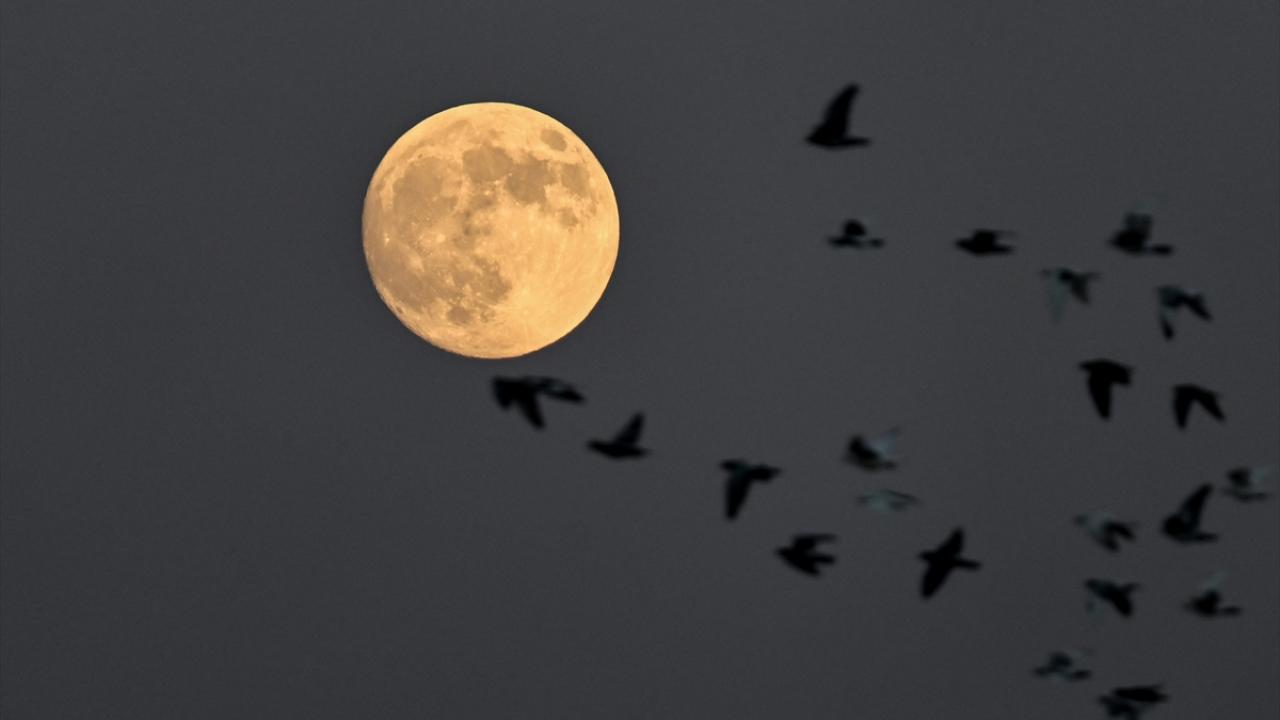 Antalya`da akşam saatlerinde beliren dolunay, kuşlarla güzel görüntü oluşturdu.