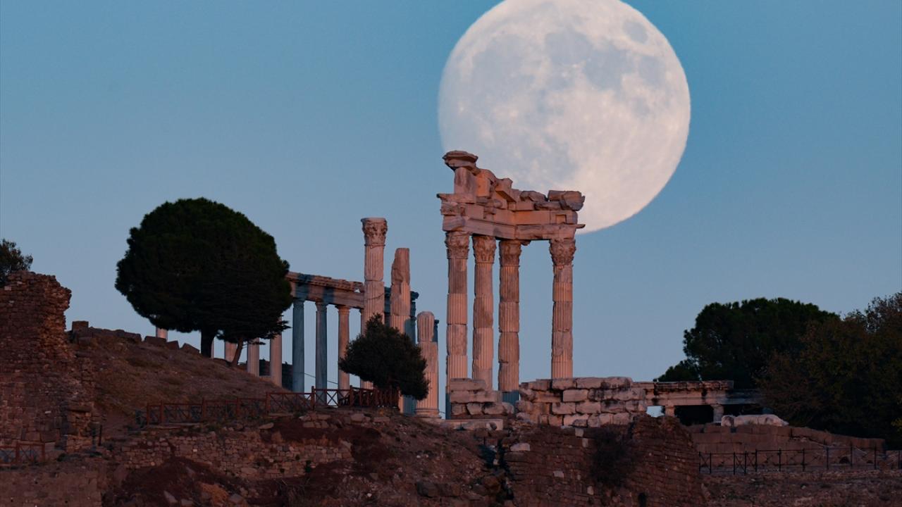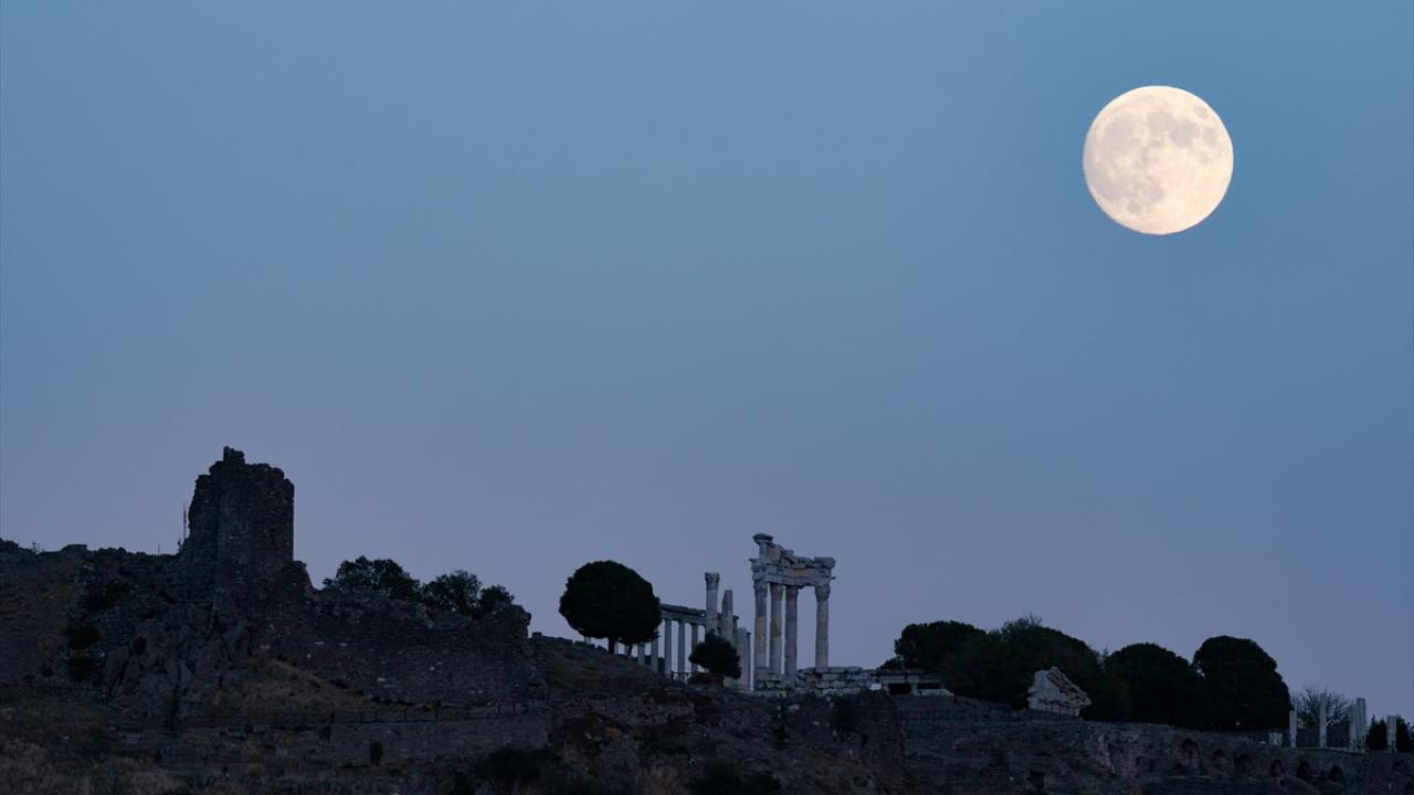 İzmir`in Bergama ilçesindeki Akropol Antik Kenti üzerinde akşam saatlerinde beliren dolunay güzel görüntü oluşturdu.