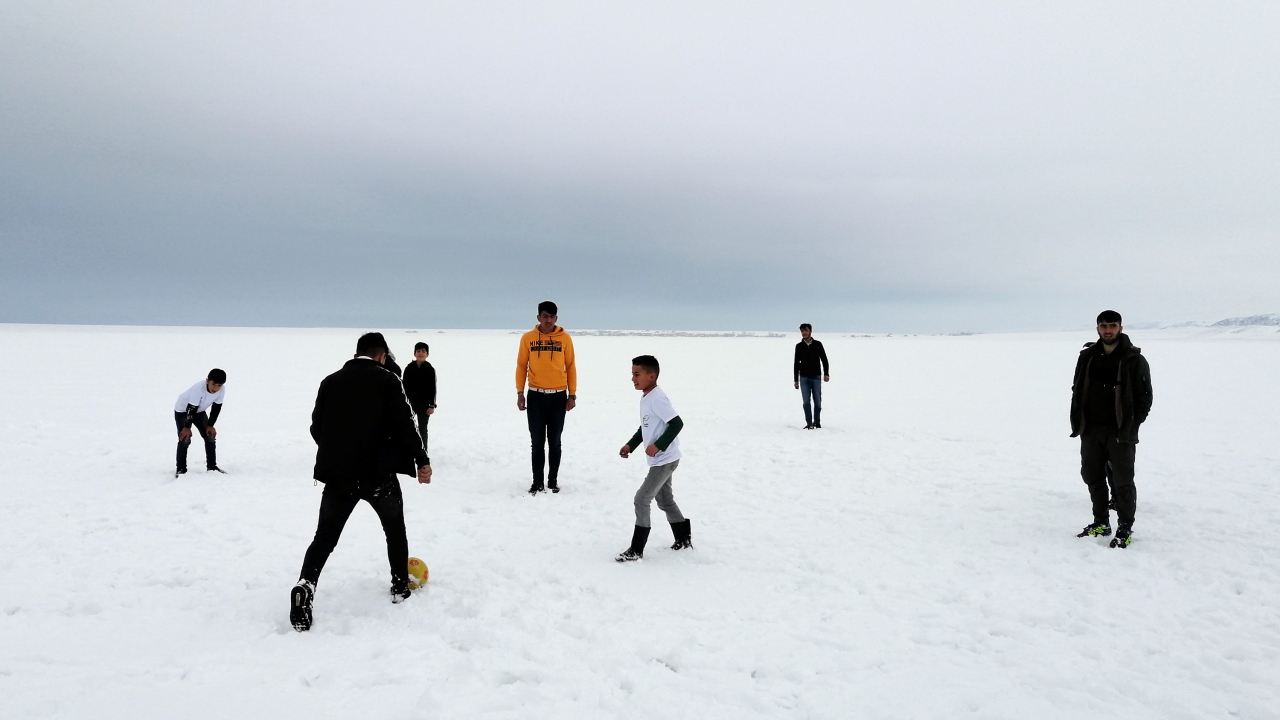 Göle kıyısı bulunan köylerde yaşayan çocuklar ve gençler yüzeyinde yaklaşık 25 santimetre kalınlığında buz tabakası oluşan gölde gün boyu futbol oynayarak eğleniyor.