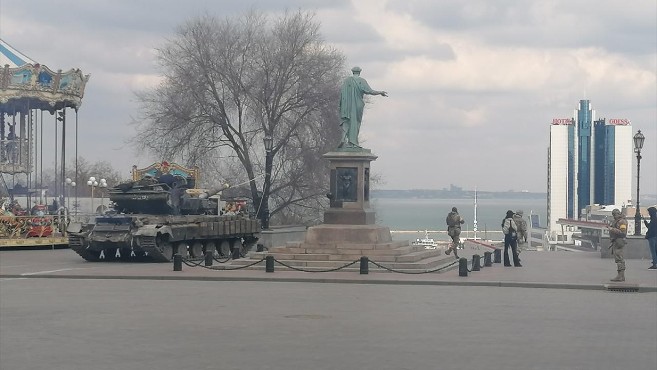 Rusya`nın Ukrayna`ya askeri müdahalesinin ardından Ukrayna`nın Odessa kentinde, Potemkin Merdivenleri yakınında Ukrayna`ya ait bir tankın devriye gezdiği görüldü.