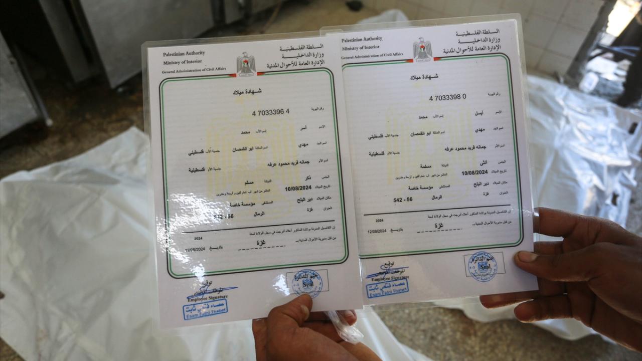 İsrail saldırıları nedeniyle Gazze Şeridi'nin kuzeyinden Deyr el-Belah kentine göç etmek zorunda kalan Filistinli baba Muhammed Ebu El-Kumsan, dört gün önce doğan ikiz bebekleri için doğum belgesi çıkarmaya gitti.