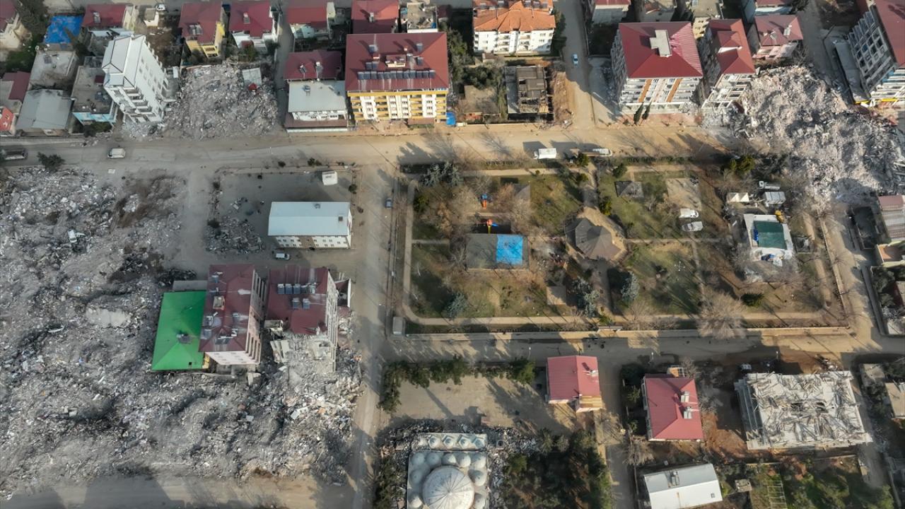 Dron ile çekilen fotoğraf ve görüntülerde ilçenin birçok noktasının enkaz yığınına dönüştüğü görülüyor.