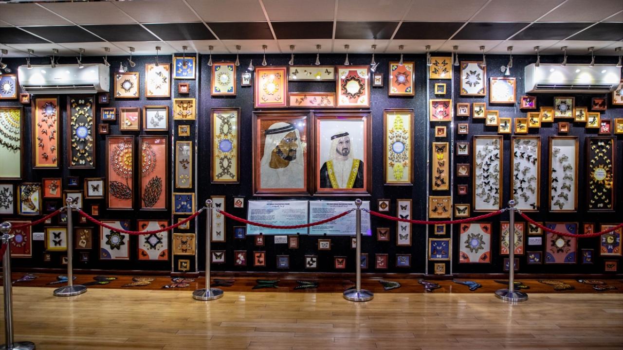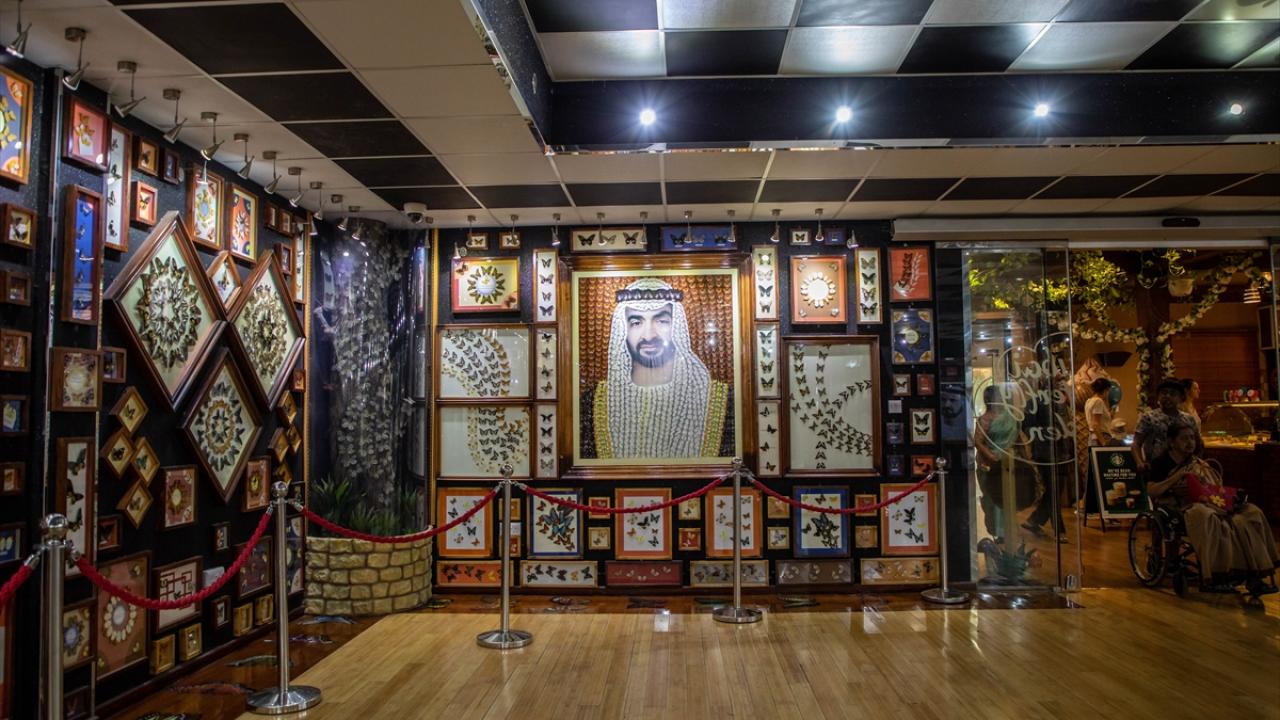Bahçede, tahnit edilen kelebeklerden oluşan BAE liderlerinin portreleri de bulunuyor.