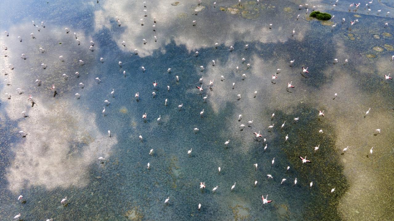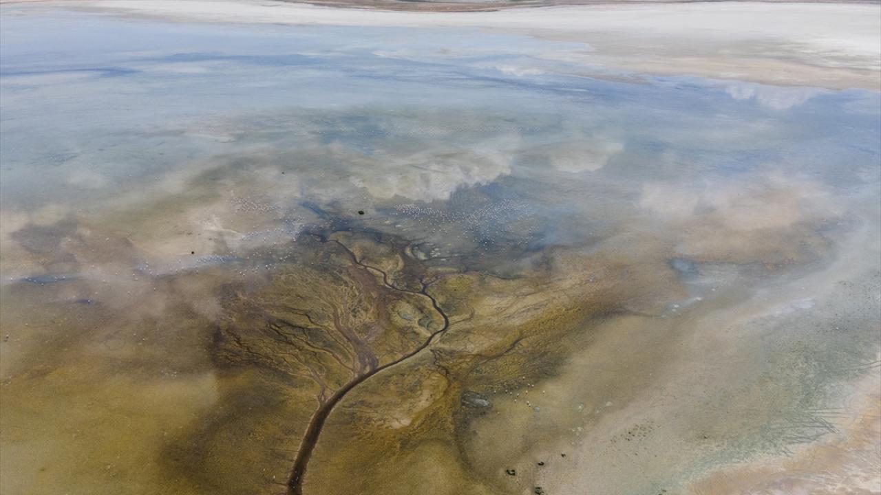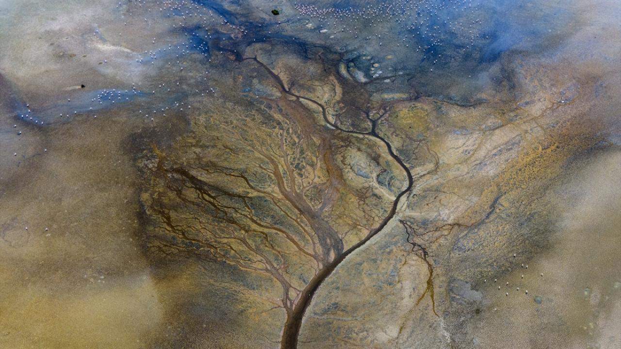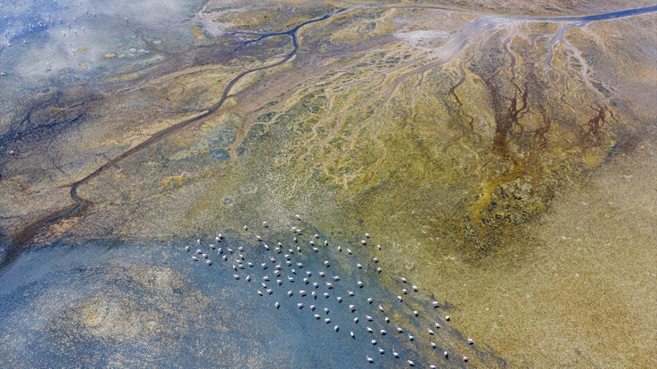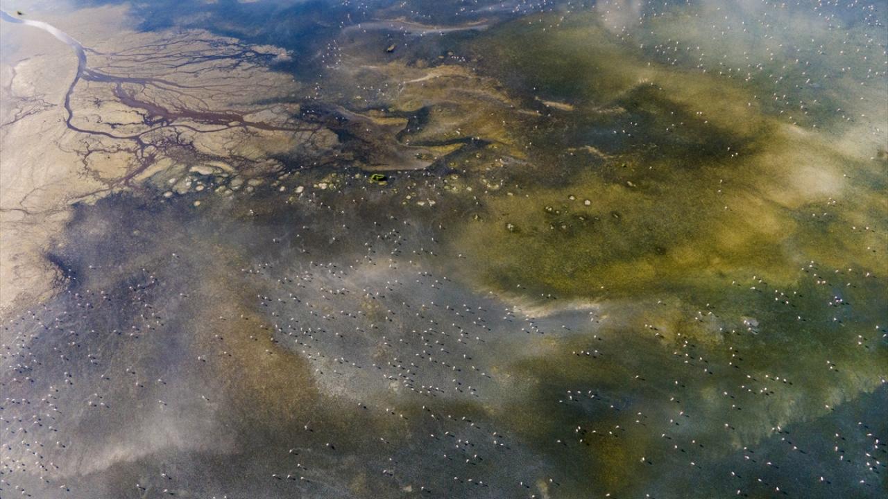 Düden Gölü’nü besleyen kanalın ağacı andıran dokusu ve flamingolar havadan görüntülendi.
