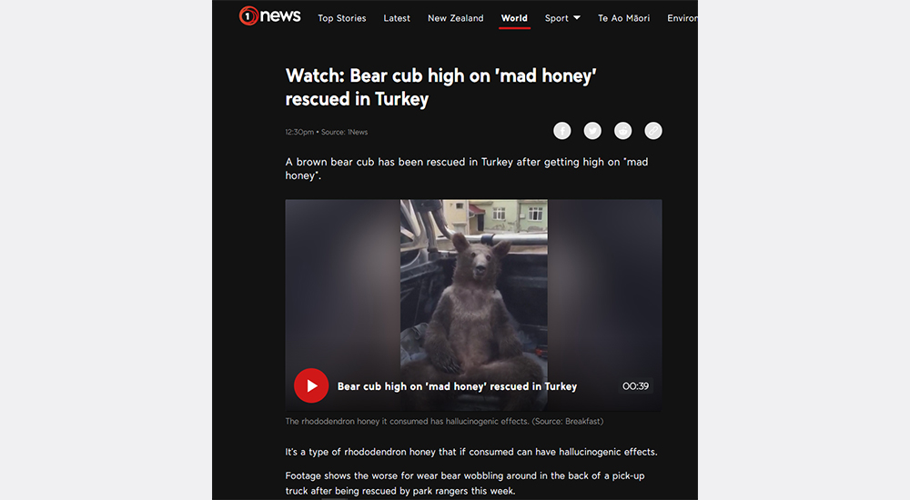 İngiliz haber ajansı BBC, "Park korucuları tarafından kurtarılan çok fazla `deli bal` tüketen halüsinojenik ayı yavrusu" şeklinde haberi duyurdu.