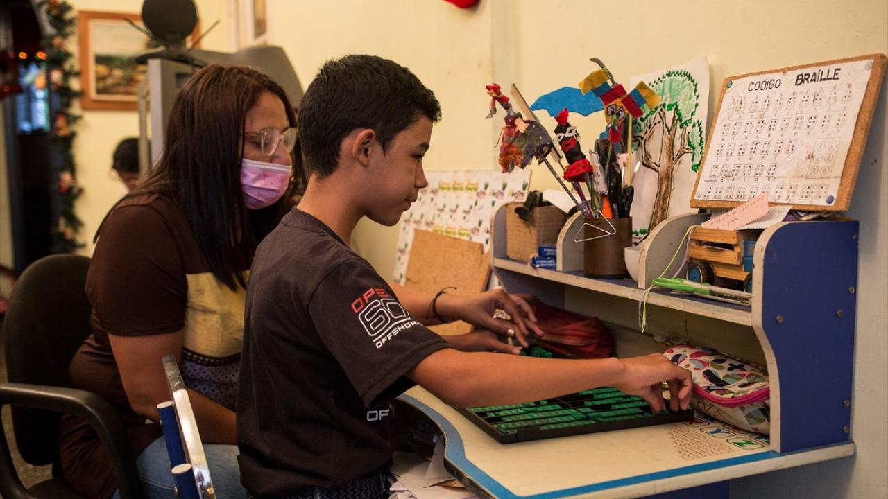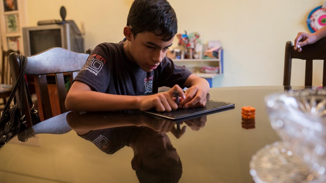 Fotoğrafta, 13 yaşındaki görme engelli Salvador Mantilla, Braille kodu şablonu kullanarak bir kağıda yazı yazarken görülüyor.