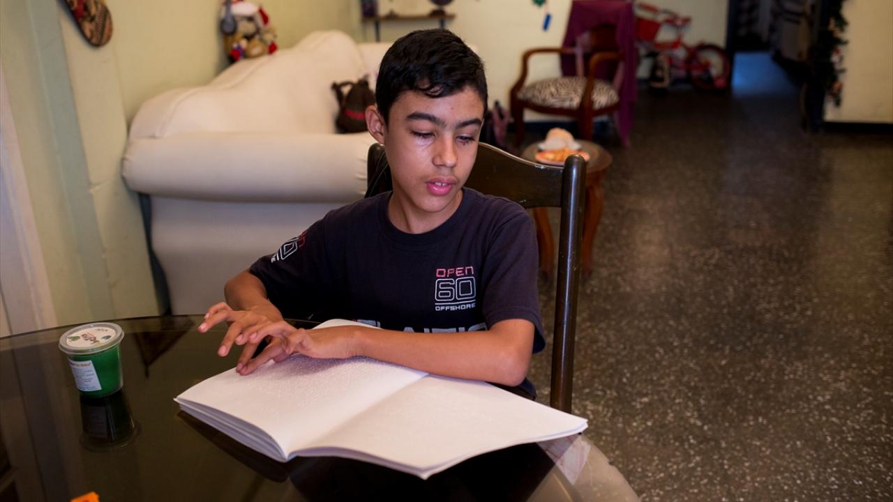 Fotoğrafta, 13 yaşındaki görme engelli Salvador Mantilla, Braille alfabesi içeren bir kitap okuyor.