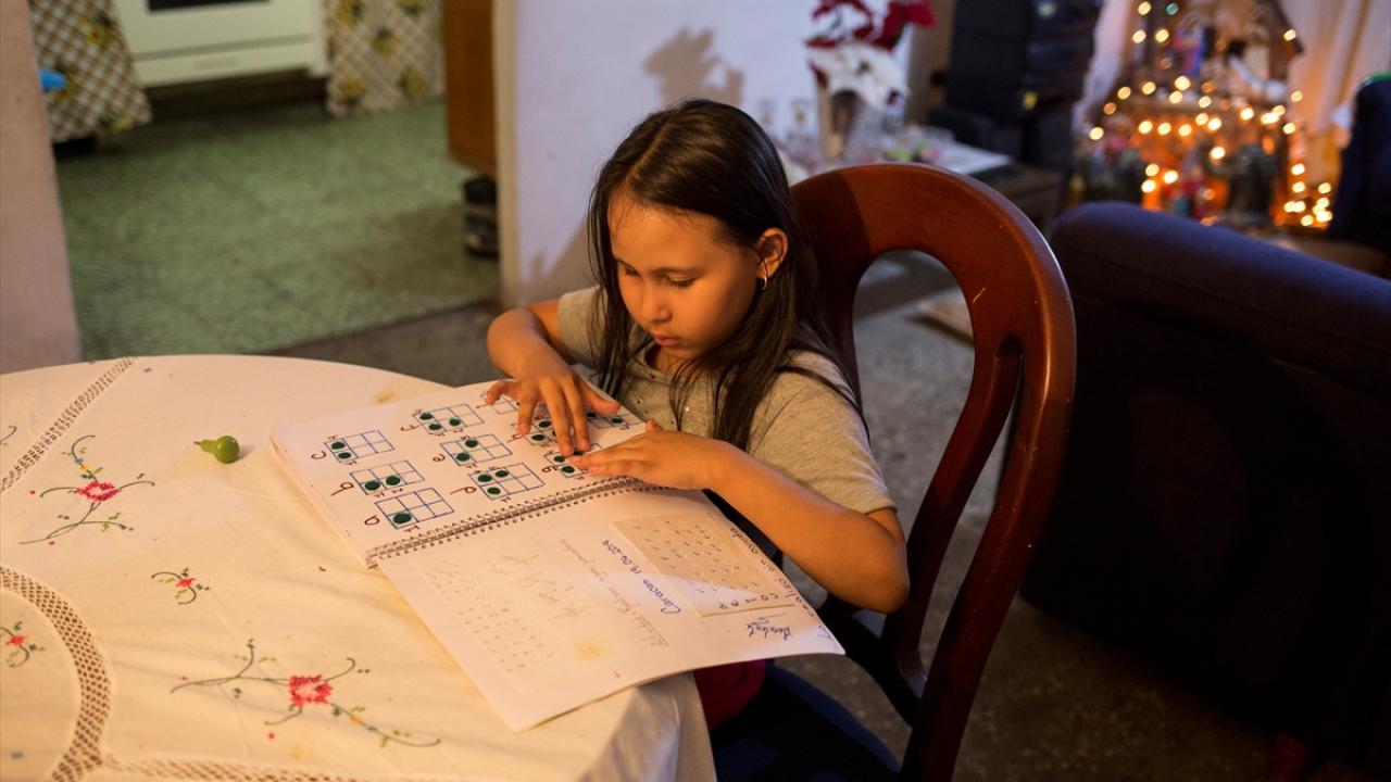 Fotoğrafta, 9 yaşındaki görme engelli Arianny Ortega, Braille alfabesi içeren bir kitap okuyor.