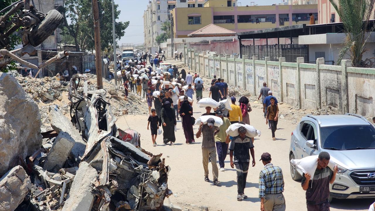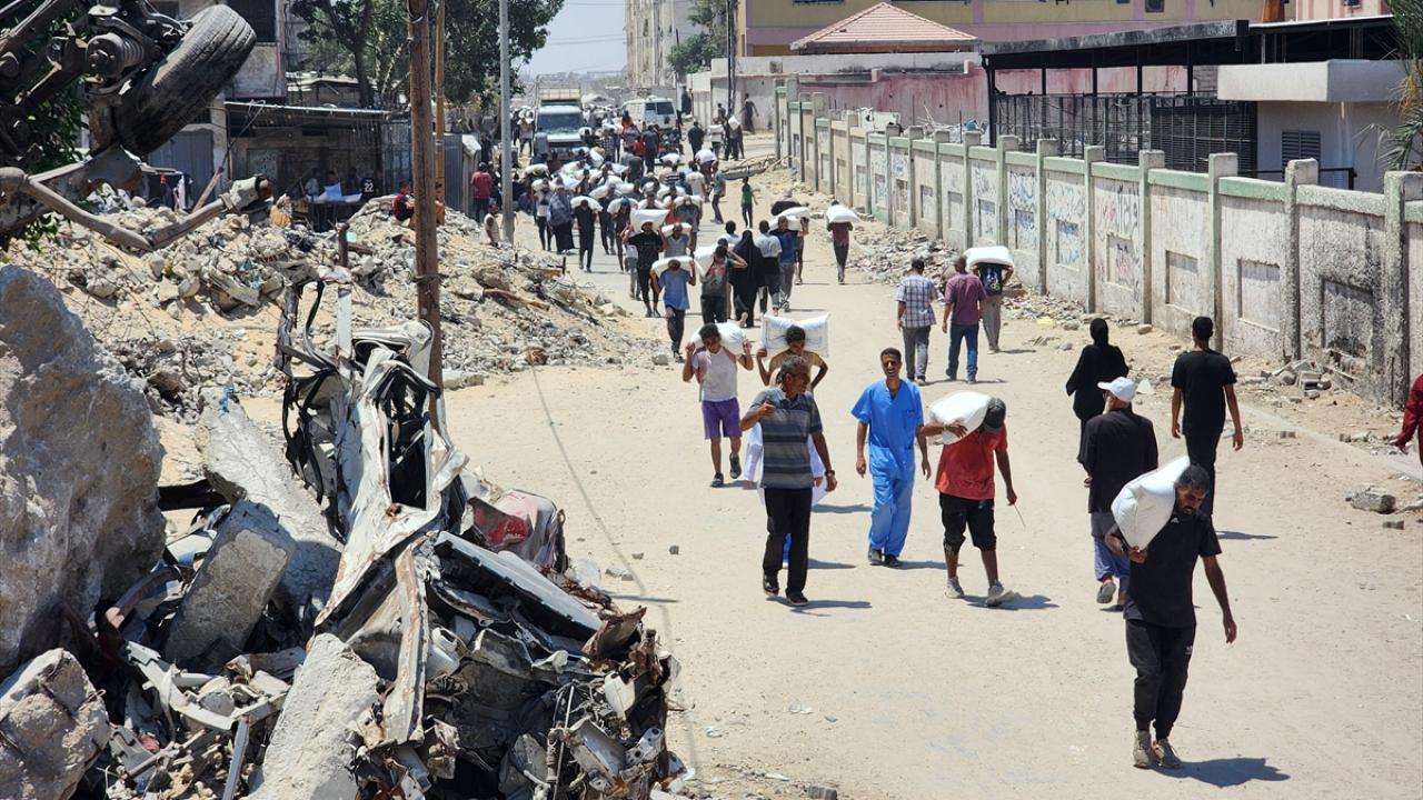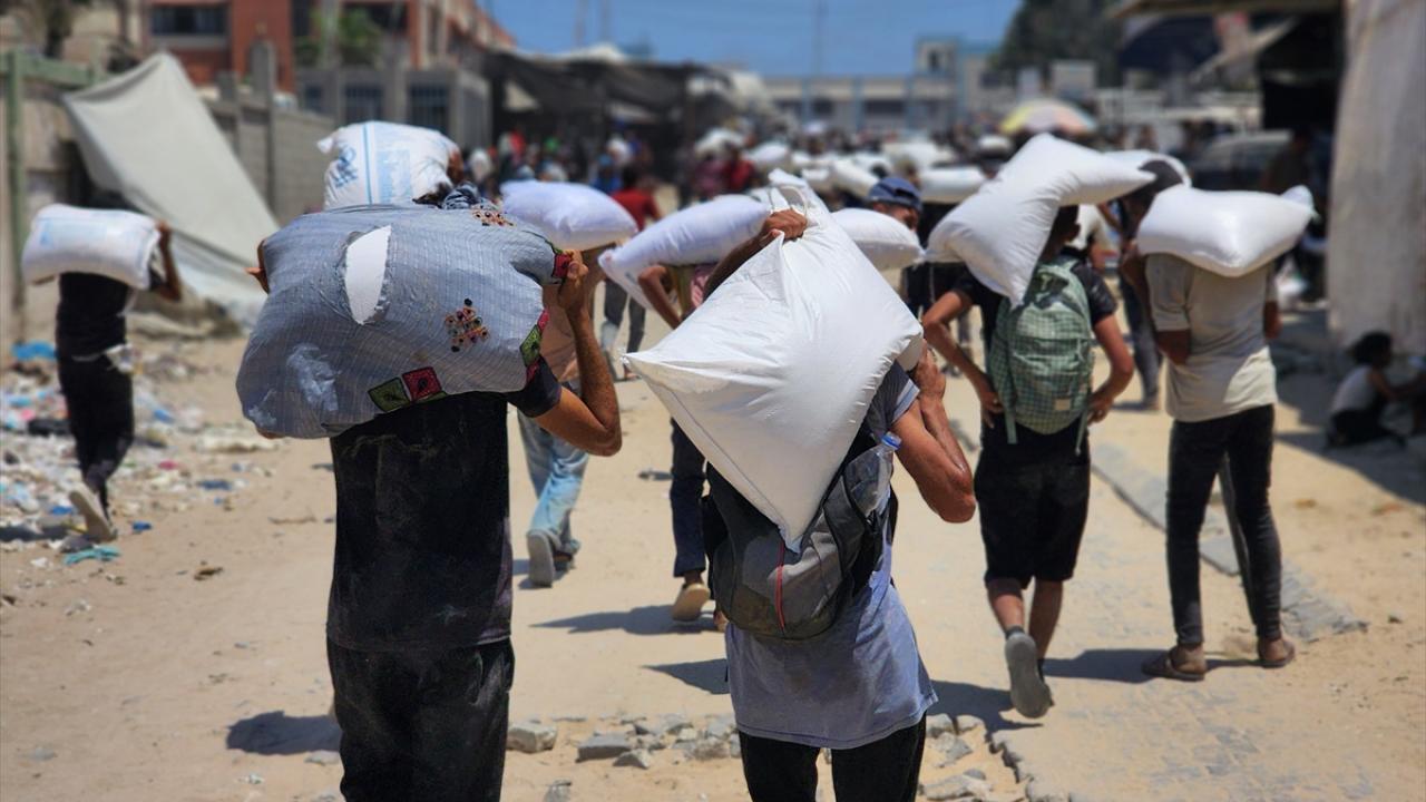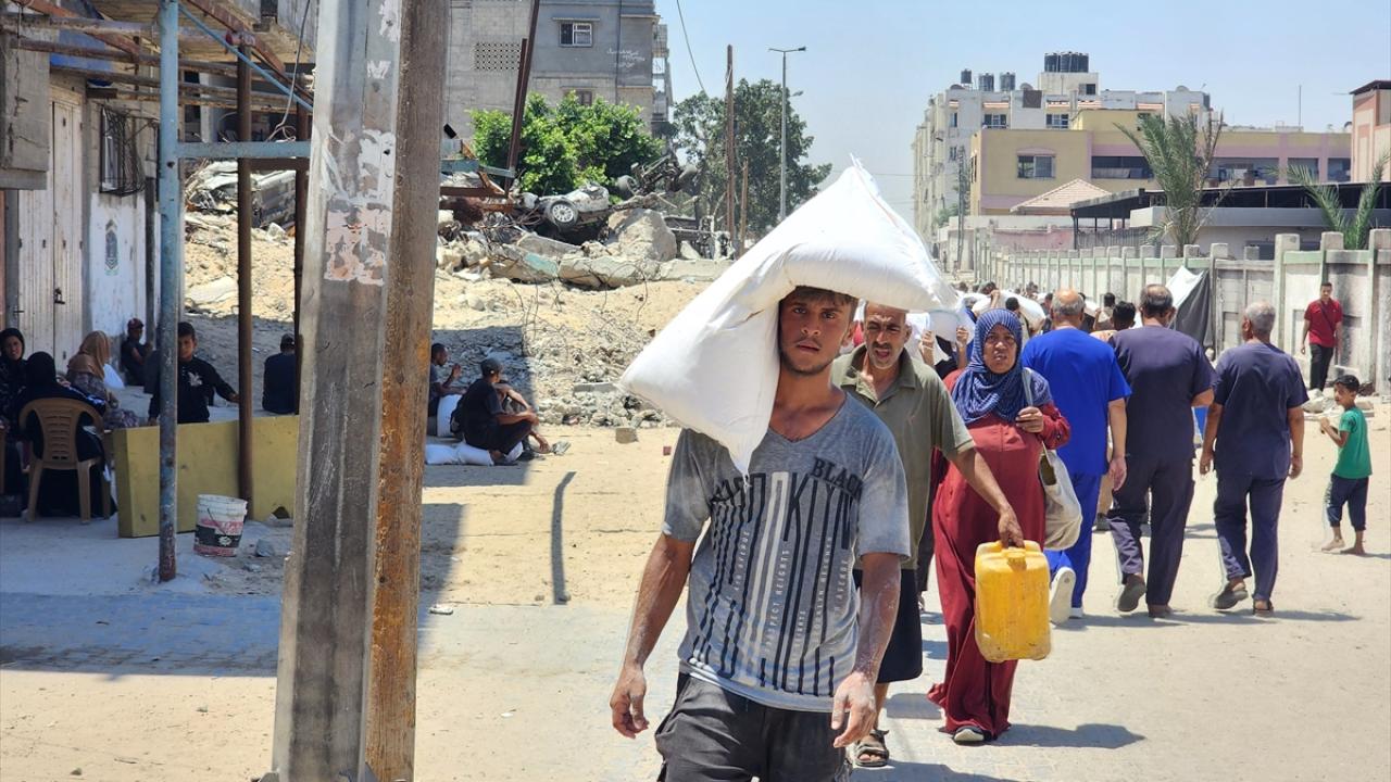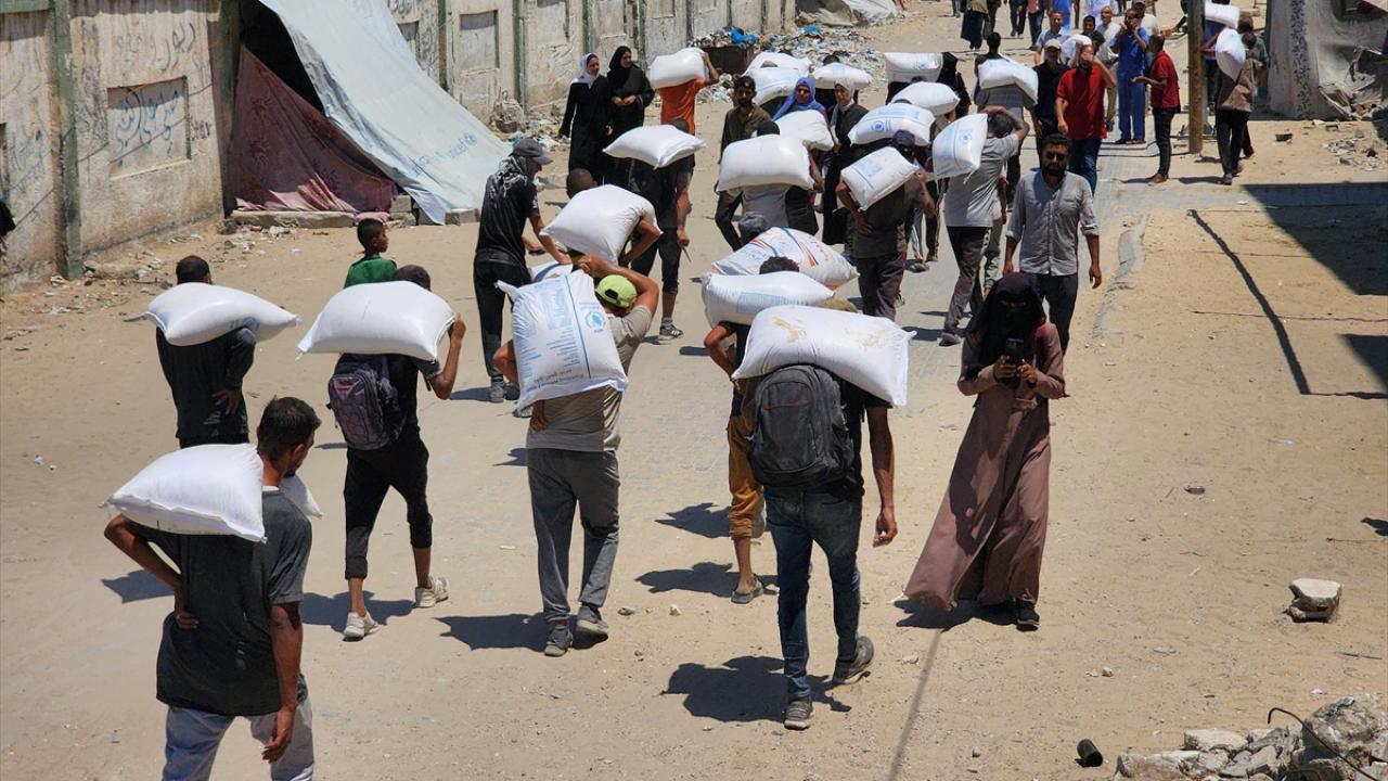 Yardım dağıtım noktasına gelen çok sayıda Filistinlinin, un çuvallarını taşıdıkları görüldü.