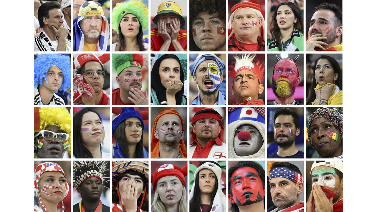 Katar’da düzenlenen 2022 Dünya Kupası’nda futbolcular sahada kıyasıya mücadele ederken, tribünlerde de takımlarını desteklemeye gelen taraftarlar kimi zaman üzüntülü kimi zaman da endişeli yüz ifadeleriyle objektiflere yansıyor.