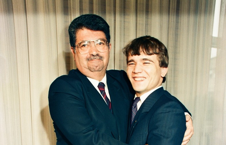 12 Ocak 1990`da Milli Halterci Naim Süleymanoğlu, dönemin Cumhurbaşkanı Turgut Özal`ın (solda), yeni yıl dolayısıyla verdiği resepsiyonda. (Arşiv)