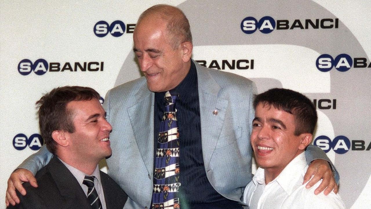 24 Ağustos 2001`de, Sabancı Center`de düzenlenen basın toplantısı sonrasında Milli Halterciler Naim Süleymanoğlu (solda) ve Halil Mutlu (sağda), İş adamı Sakıp Sabancı`yı havaya kaldırmışlardı. (Arşiv)