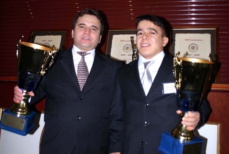 3 Mart 2005`de Türk Halterci Naim Süleymanoğlu (solda) ile Halil Mutlu, Uluslararası Halter Federasyonu`nun 100. yıl Altın Genel Kurulu toplantısında ödül almıştı. (Arşiv)