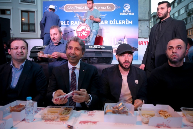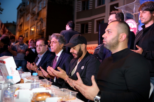 Real Madrid`in Cezayir asıllı Fransız futbolcusu Karim Benzema (sağ 2), İstanbul`un Fatih İlçesi`nde düzenlenen sokak iftarına katıldı. İftarda Fatih Belediye Başkanı Mustafa Demir (sol 2) ve menajer Ümit Akbulut (sağda) da yer aldı.