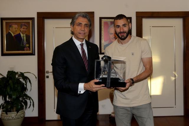 Real Madrid`in Cezayir asıllı Fransız futbolcusu Karim Benzema (sağda), Fatih Belediye Başkanlığı`nı ziyaret etti. Ziyarette, Fatih Belediye Başkanı Mustafa Demir (solda), Benzema`ya hediye takdim etti.