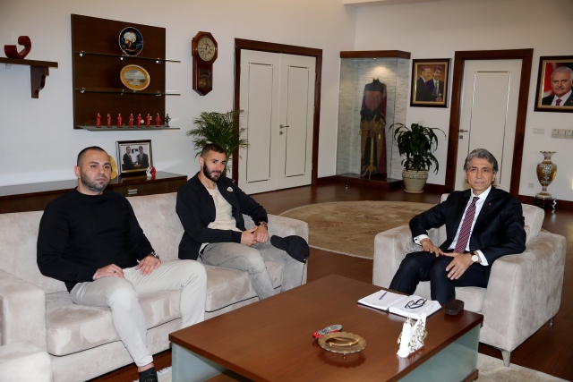 Real Madrid`in Cezayir asıllı Fransız futbolcusu Karim Benzema (sol 2), menajer Ümit Akbulut (solda), Fatih Belediye Başkanlığı`nda Fatih Belediye Başkanı Mustafa Demir`i (sağda) ziyaret etti.