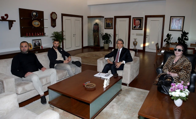 Real Madrid`in Cezayir asıllı Fransız futbolcusu Karim Benzema (sol 2), menajer Ümit Akbulut (solda) ve modacı Nur Yerlitaş (sağda), Fatih Belediye Başkanlığı`nda Fatih Belediye Başkanı Mustafa Demir`i (sağ 2) ziyaret etti.