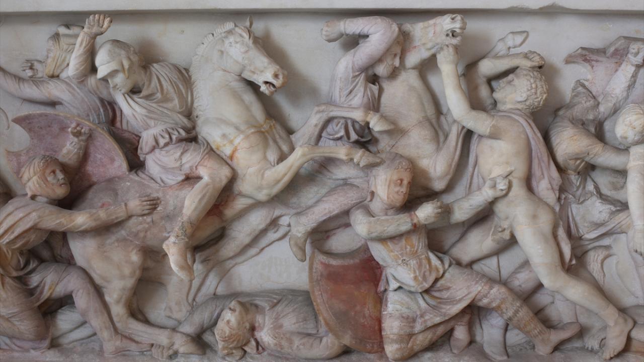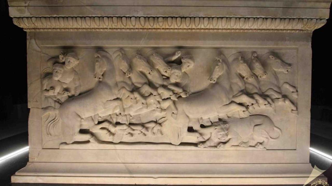 İskender Lahdi, 1887`de bulundu. Yaklaşık 2 bin 500 yıllık lahdin uzun cephesinde Yunan ve Pers askerleri birbirlerine karşı savaş halinde betimlenmiş. Sahnenin en solunda, lahde adını veren at üzerindeki figürün, aslan postu giymesinden dolayı Büyük İskender olduğu düşünülüyor. Hareket halinin oldukça başarılı işlendiği bu sahnedeki tasvirin, milattan önce 333 yılında Büyük İskender`in Pers kralı III. Darius`u mağlup ettiği İssos Savaşı`ndan bir sahne olduğu değerlendiriliyor.